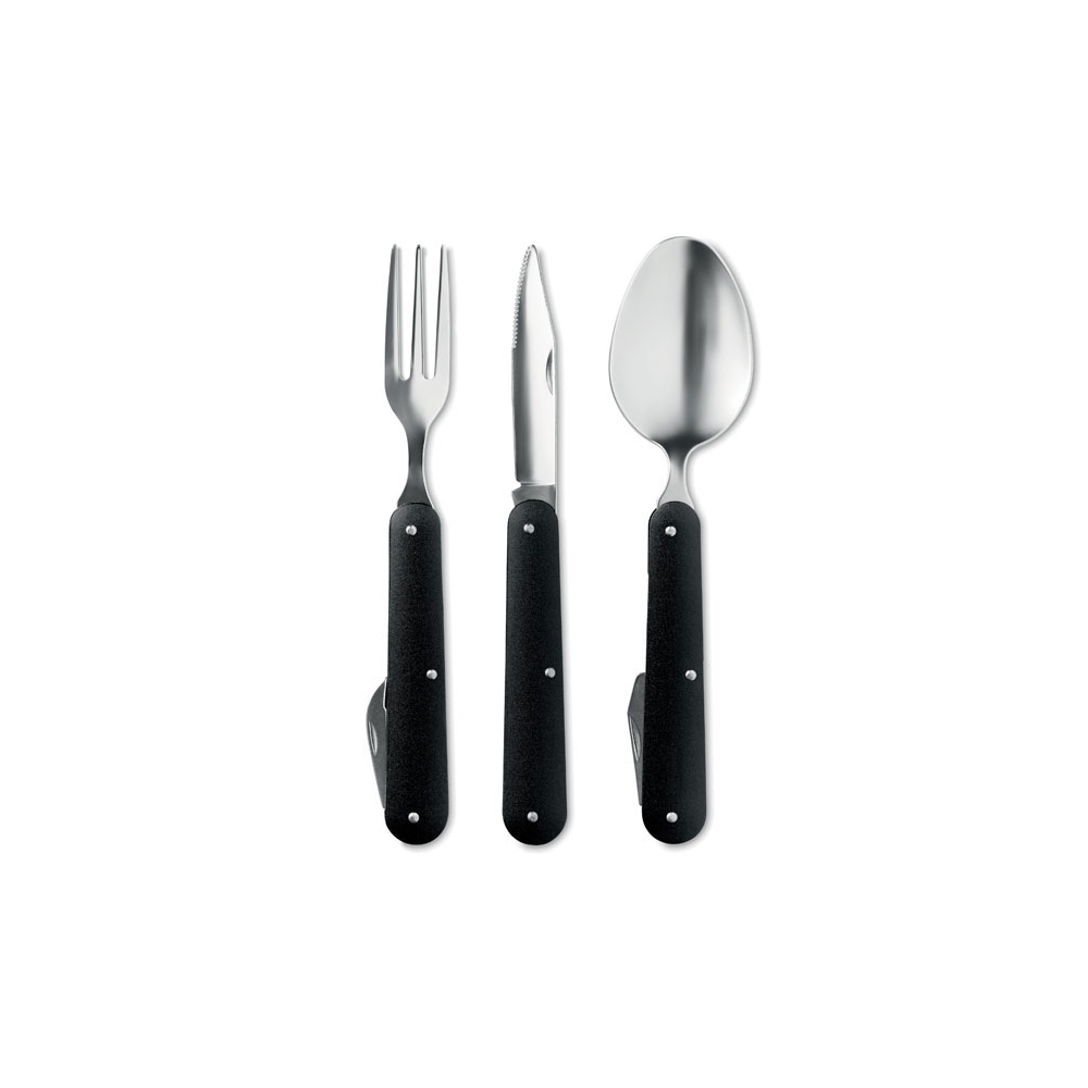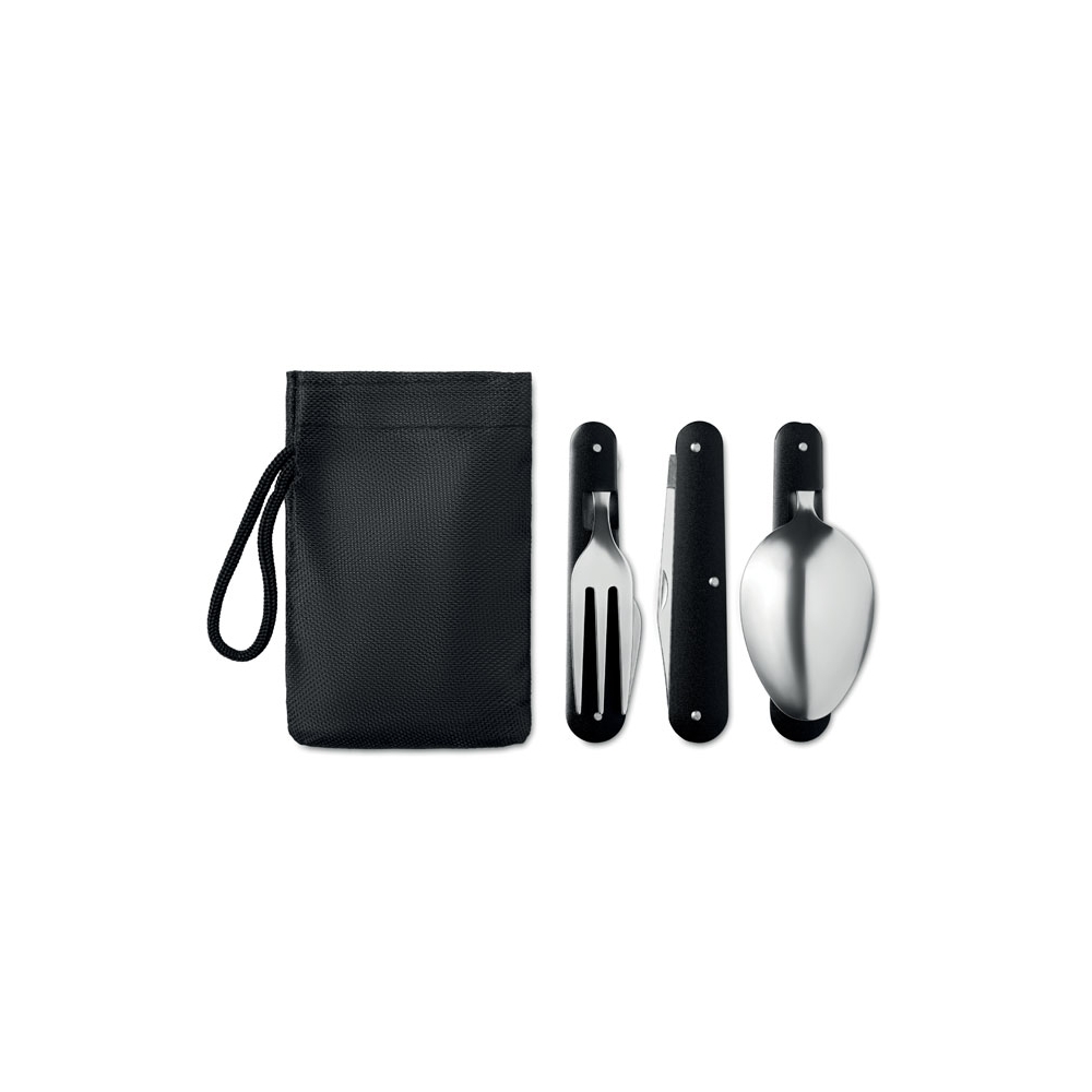 Camping Besteck aus Edelstahl. Set bestehend aus faltbarem Messer, Gabel, Löffel. Mit integriertem Dosenöffner und Kapselheber. Lieferung in 300D Polyester Beutel.