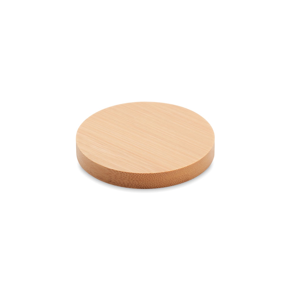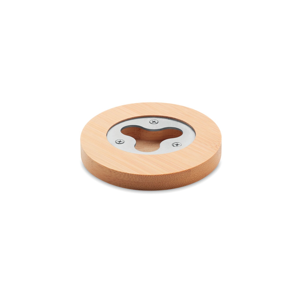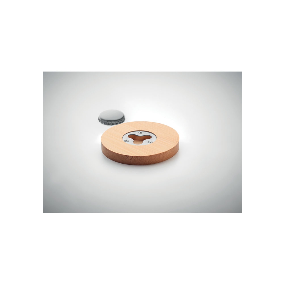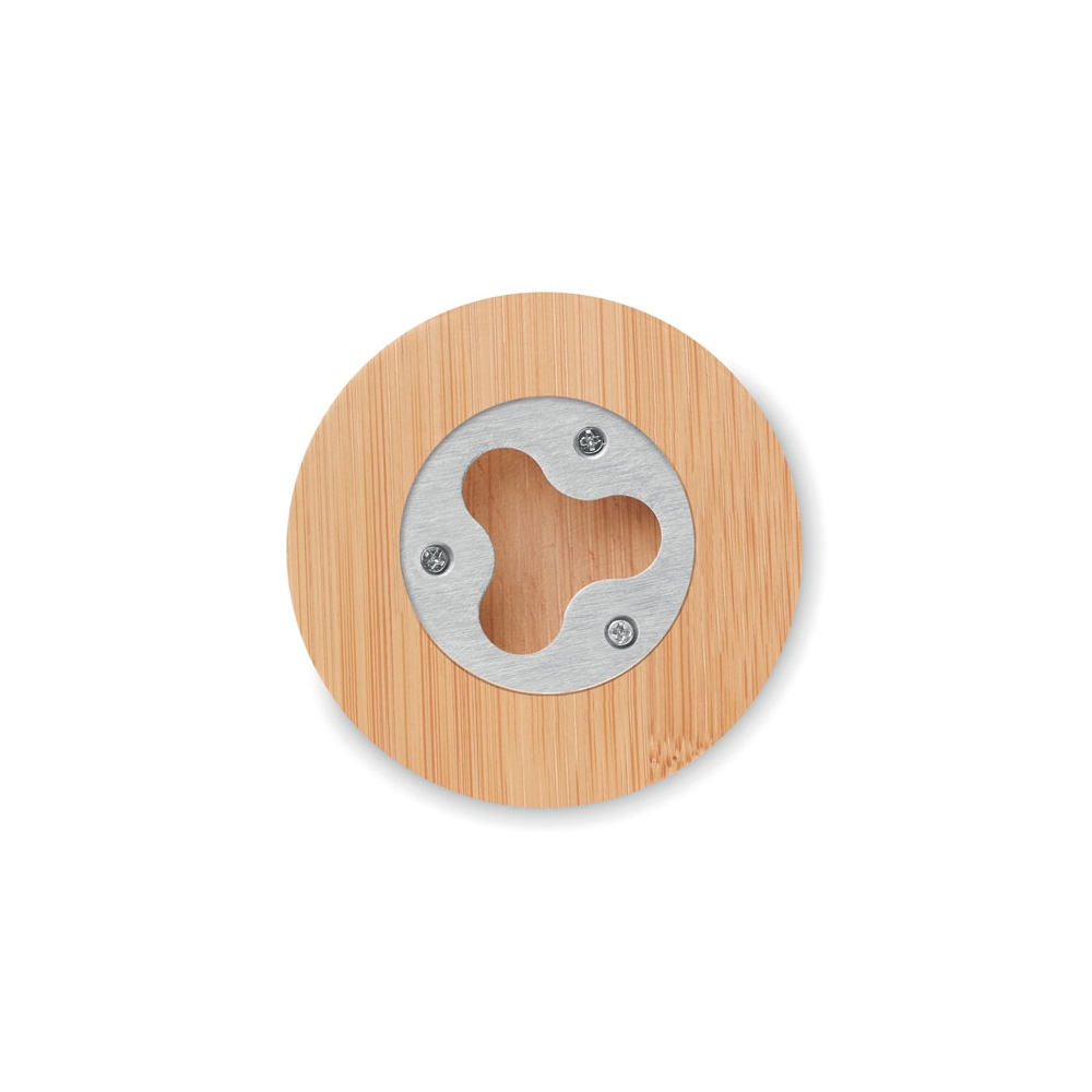 Untersetzer aus Bambus mit integriertem Kapselheber. Da Bambus ein natürliches Material ist, können Farbton und Maße pro Artikel variieren. Dies kann zu Abweichungen im Ergebnis der Veredlung führen.