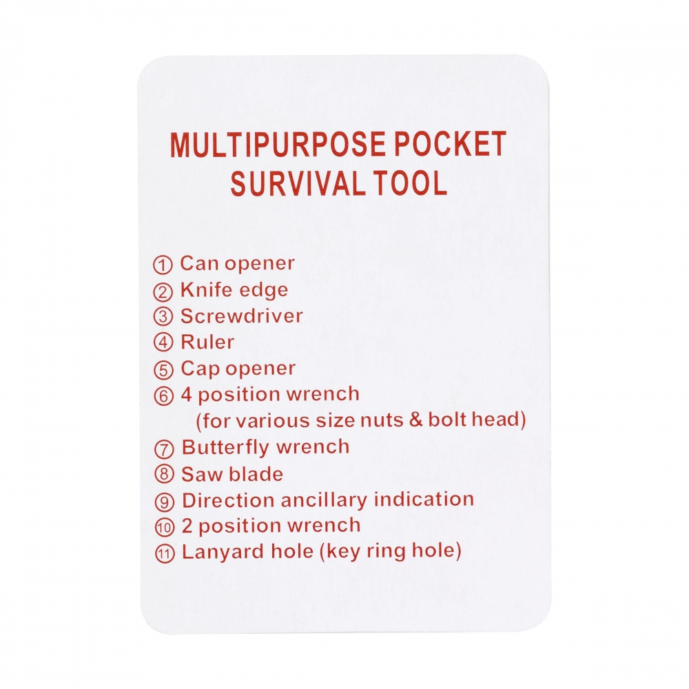 Multitool aus Edelstahl in Kreditkartenformat mit 11 Funktionen: Dosenöffner, Schraubenzieher, Lineal, Kapselheber, Schraubenschlüssel, Flügelzange, Säge, Winkelmesser, 2-seitiger Schraubenschlüssel und Schlüsselanhänger. In einem Etui aus Imitatleder. Inklusive Gebrauchsanweisung.