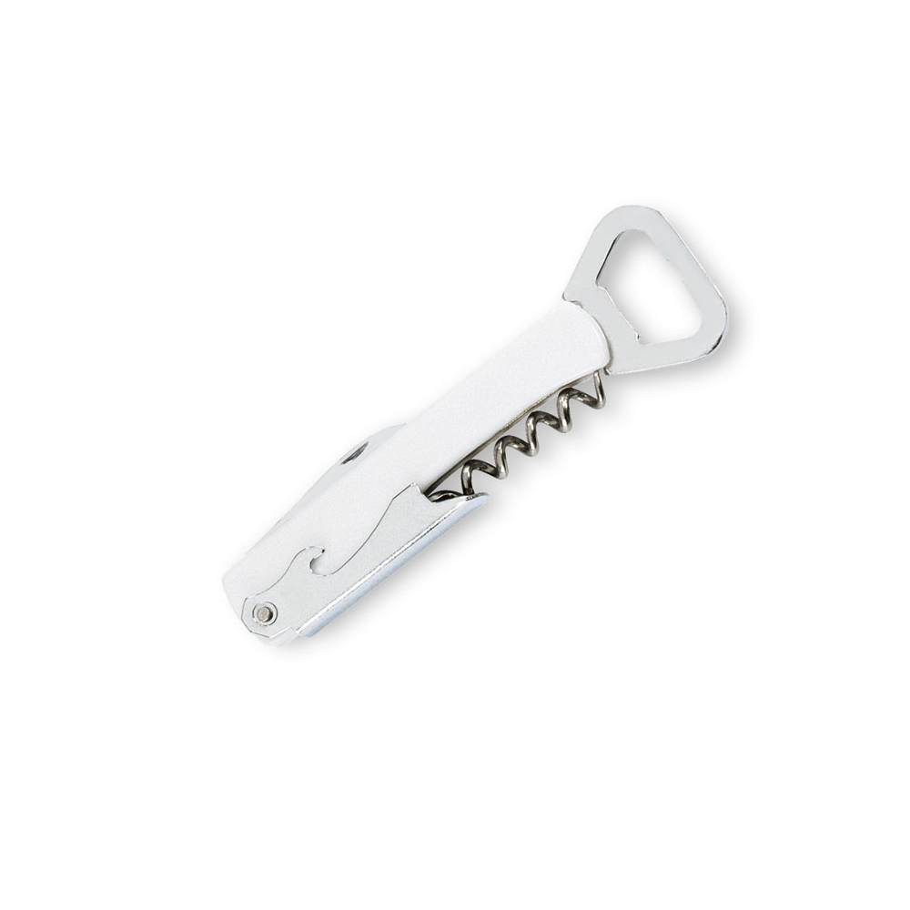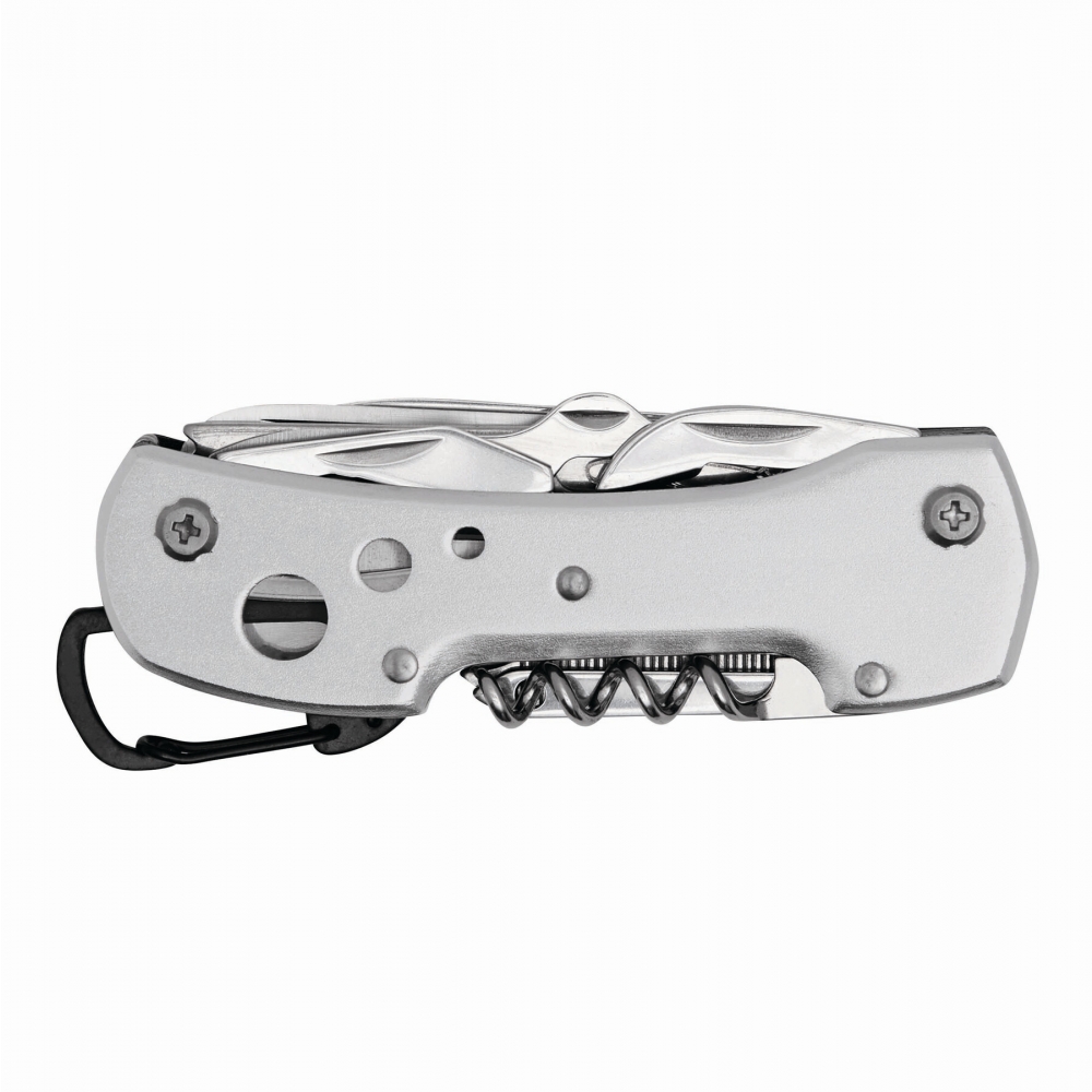 Multi-Tool-Taschenmesser aus recyceltem Aluminium. 5 Funktionen: Große Klinge, Kapselheber, Schraubendreher, Korkenzieher und Dosenöffner.