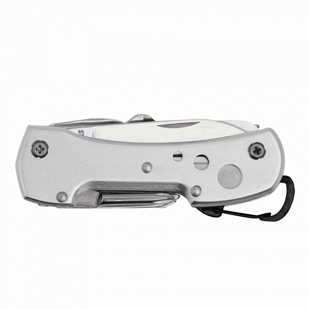 Kompakte Multizange aus Edelstahl mit Aluminiumhandgriff in Metallic-Look. 9-teilig mit 13 Funktionen: Zange, Isolierzange, 3 Schraubenzieher, Kreuzschraubenzieher, Feile, Säge / Fischentschupper, Messer, Reibahle, Dosenöffner und Kapselheber. In einem 600D Nylonetui. Beachten Sie, dass möglicherweise lokale Vorschriften für den Besitz und / oder das Tragen von Messern oder Multitools in der Öffentlichkeit gelten. Wird einzeln in einem Kraftkarton geliefert.