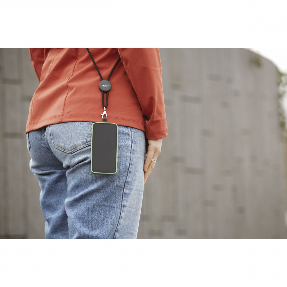 Verstellbares Handy-Lanyard mit Rundschnur aus 100% GRS RPET Polyester. Mit Metallkarabiner, verstellbarer Schlaufe und Stoppern aus Aluminium und einem runden Tag aus recyceltem Kunststoff. Der universelle Patch ermöglicht es, Ihr Smartphone an Ihrem Schlüsselband zu befestigen. Mit dieser Kombination tragen Sie Ihr Smartphone sicher um Ihren Hals. So haben Sie Ihr Mobiltelefon schnell zur Hand und halten Ihre Taschen und Hände frei. Das Patch ist mit den meisten Kombinationen aus Smartphone und Hülle kompatibel, außer mit Hüllen mit offener Unterseite. Das System ist so konzipiert, dass es den Ladeanschluss des Telefons nicht blocki ...