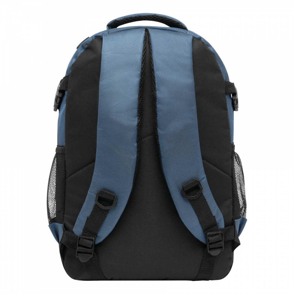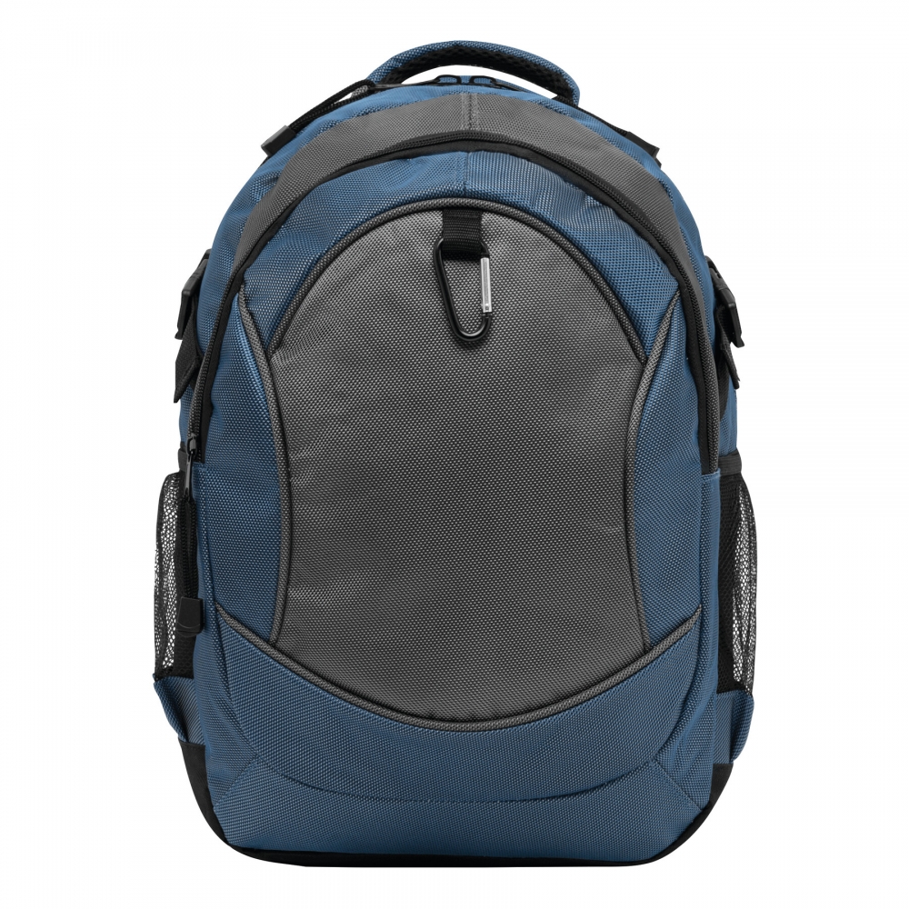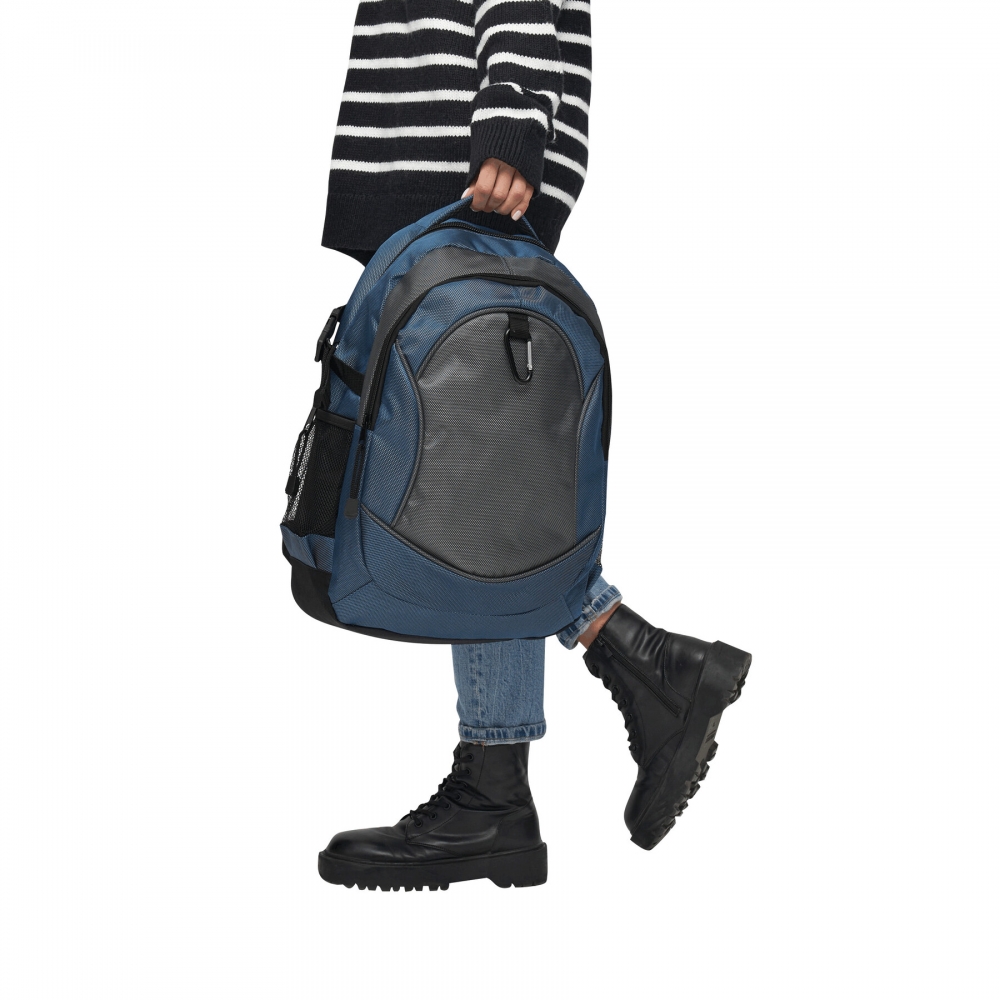 Rucksack HIGH-CLASS: Reißverschluss-Vorfach außen mit Karabinerhaken, Reißverschluss-Hauptfach mit Steckfach und kleiner Reißverschlusstasche innen sowie mit Kopfhörer-Kabelausgang, 2 seitliche Netzfächer und Kompressionsgurte, verstärkter Tragegriff, Schultergurte und Rückenbereich mit komfortabler Polsterung, der Karabiner ist NICHT als Sicherung beim Klettern geeignet
