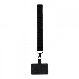 Handschlaufe für Handyhalter aus Polyester mit Telefoneinsatz und Metallkarabiner.