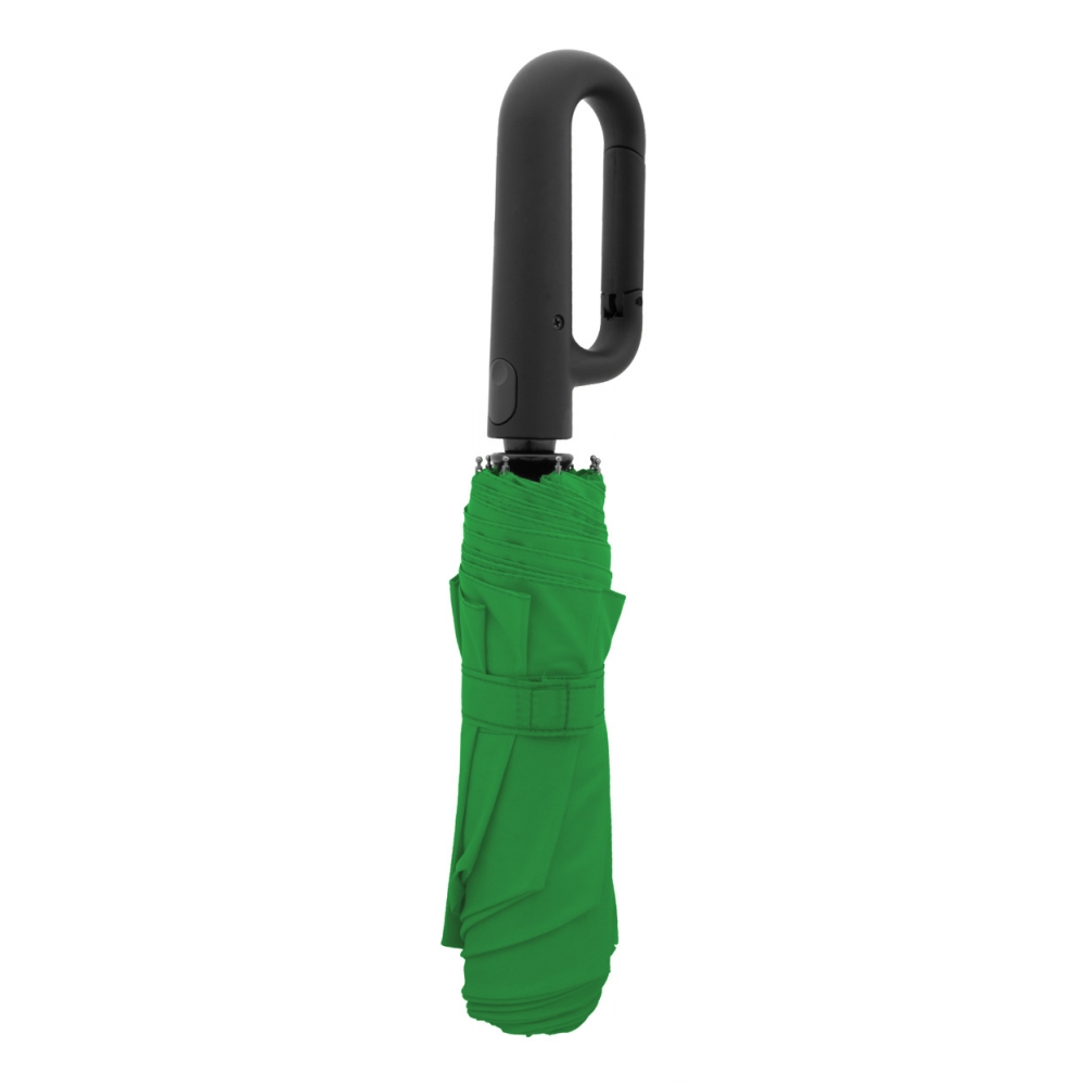 Vollautomatischer (Öffnen / Schließen) Windproof-Taschenschirm mit 8 Segmenten in farblich passender Hülle. Mit Metallrahmen, Fiberglasspeichen und gummiertem Karabinergriff. Material: 190T RPET-Pongee. Mit RPET-Label.