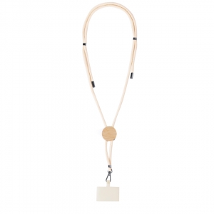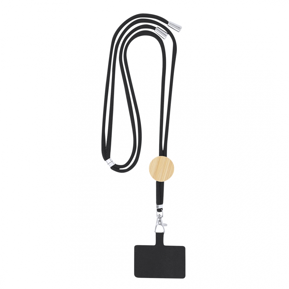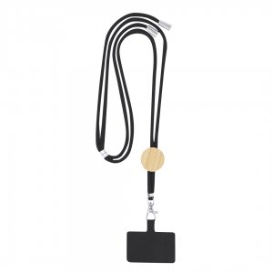 Originelles Schlüsselband mit Smarphone-Halterung. Aus strapazierfähiger Baumwolle, mit Bambuseinsatz für das Branding. Halterungskarte zur Befestigung zwischen Smartphone und Hülle und drehbarem Karabinerhaken aus Metall. Verstellbares Band mit verchromten Beschlägen an den Enden der Kordeln. Materialien wie Bambus fördern die Verwendung von natürlichen Rohstoffen und reduzieren die Schadstoffemissionen. Es handelt sich um eine sehr widerstandsfähige und vielseitige Pflanze, die schnell wächst und sich regeneriert, was sie zu einer ausgezeichneten Alternative zur Verwendung von traditionellem Holz macht.