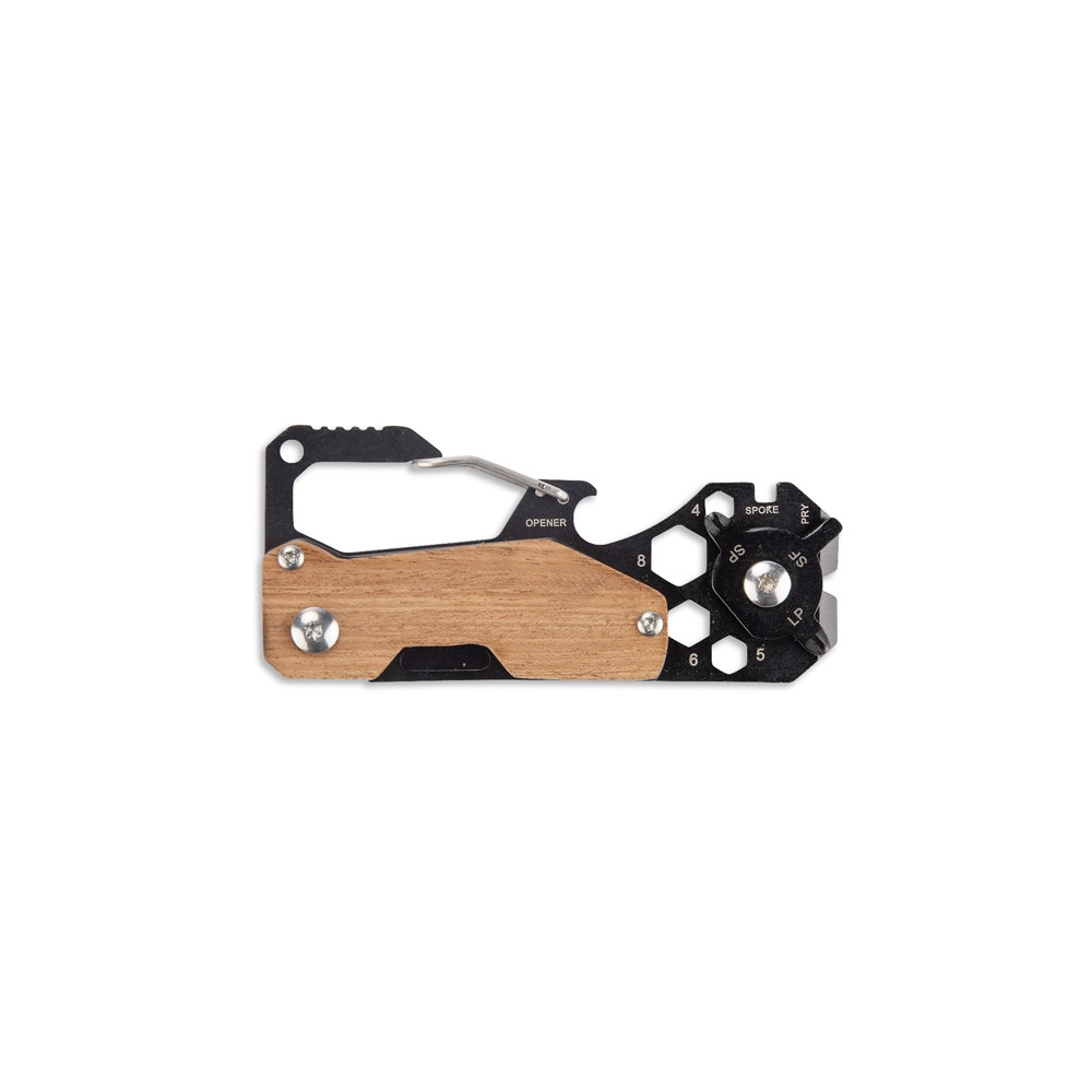 Das FINLI Multifunktionstool mit Karabiner ist eine praktische Lösung für jede Situation. Aus Metall mit Holzelementen gefertigt, vereint es eine Maßband / Liniale, Karabiner zum Befestigen an einem Gürtel oder Rucksack, Flaschenöffner, Messer, Schlitz- und Kreuzschlitzschraubendreher, Brechstangenschlüssel, Speichenschlüssel und Sechskantschlüssel. Mit der Hebelfunktion ist es ein ideales Werkzeug für den täglichen Gebrauch und Servicearbeiten.