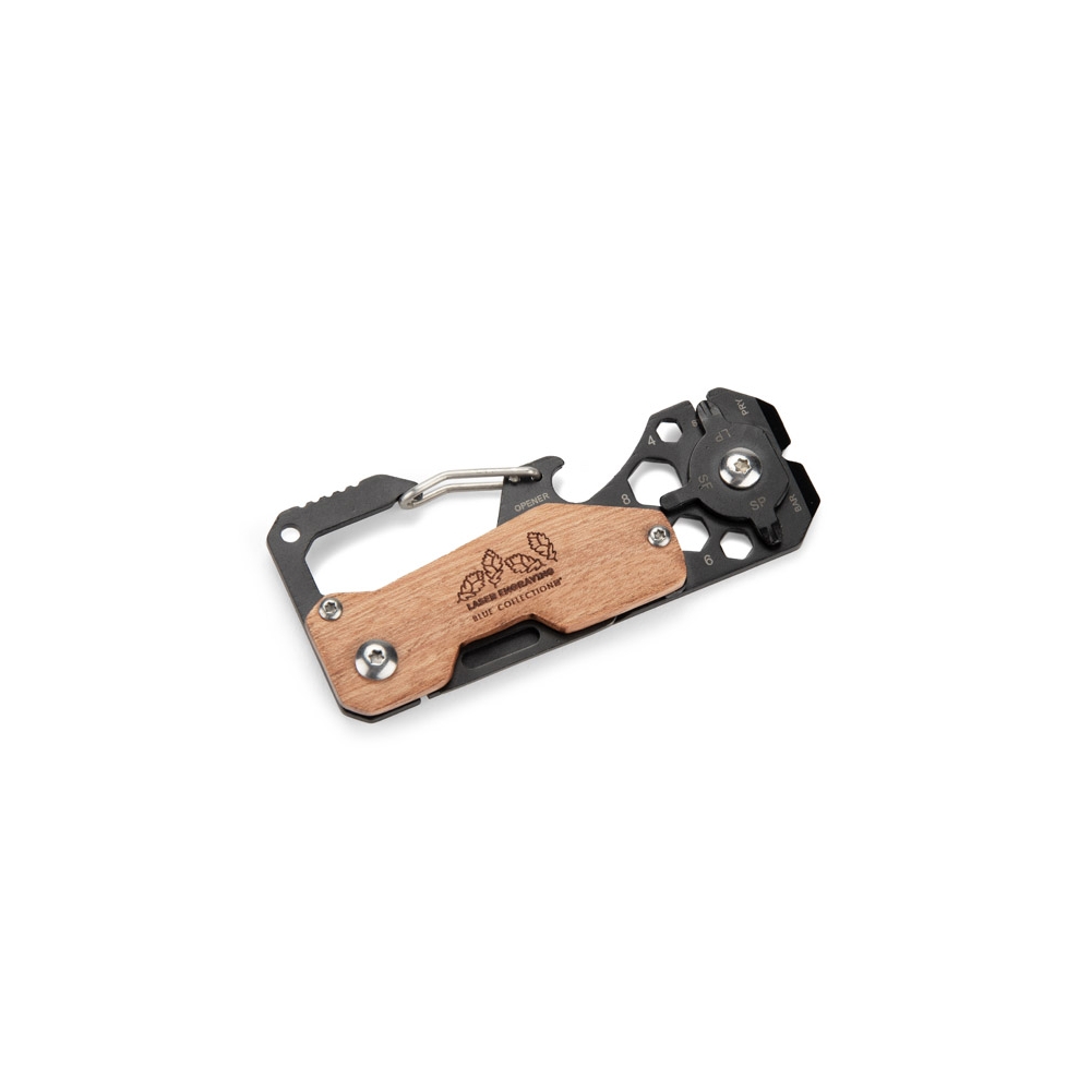 Taschenmesser aus Edelstahl mit Karabiner, Bambusgriff und 9 Funktionen.