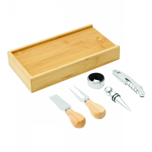Wein- und Käseset BAMBOO WINE, in Bambus-Box, 6-teilig: bestehend aus Edelstahl-Tropfring, Metall-Flaschenverschluss, Edelstahl-Kellnermesser, Käsemesser und Gabel mit Holzgriff, Rückseite des Deckels als Schneidebrett nutzbar, in Box