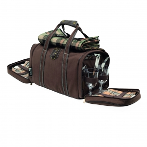 Picknicktasche 4 PICKNICK für 4 Personen: seitliche Reißverschlusstaschen gefüllt mit je 4 Kunststofftellern und -gläsern, Metalllöffeln, -gabeln und -messern, Servietten und ein Kellnermesser, isoliertes Reißverschluss-Kühlfach für Getränke und Lebensmittel, inkl. Picknickdecke (135 x 113 cm) mit schmutzabweisender Unterseite, verstell- und abnehmbarem Schultergurt, 2 Tragegriffe