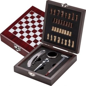 Luxus-Weinset, 5-tlg., mit einem Kellnermesser, Tropfring, Flaschenverschluss und Weinthermometer, inklusive Schachspiel und Figuren in einer Holz-Geschenkbox.