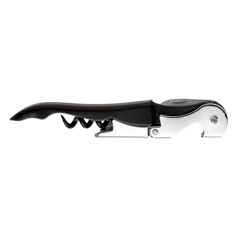 Kellnermesser aus Metall mit Flaschenöffner, Folienschneider, sowie Korkenzieher mit 2 Hebestufen. Ihre Werbung wird auf die schwarze Fläche gelasert.