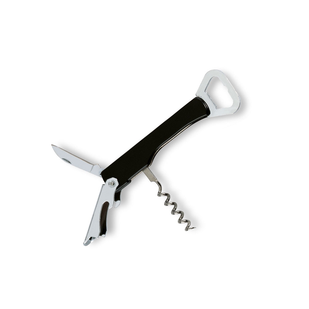 Griff aus schwarzem ABS. Klinge zur Entfernung der Weinmanschette, Korkenzieher mit 5 Spiralen, Hebel zur anstrengungsfreien Entfernung des Korkens, Flaschenöffner.
