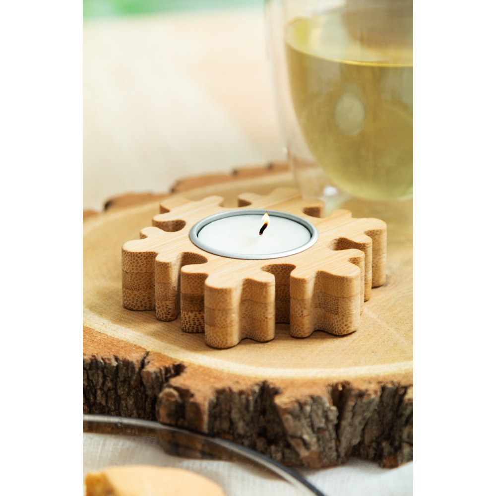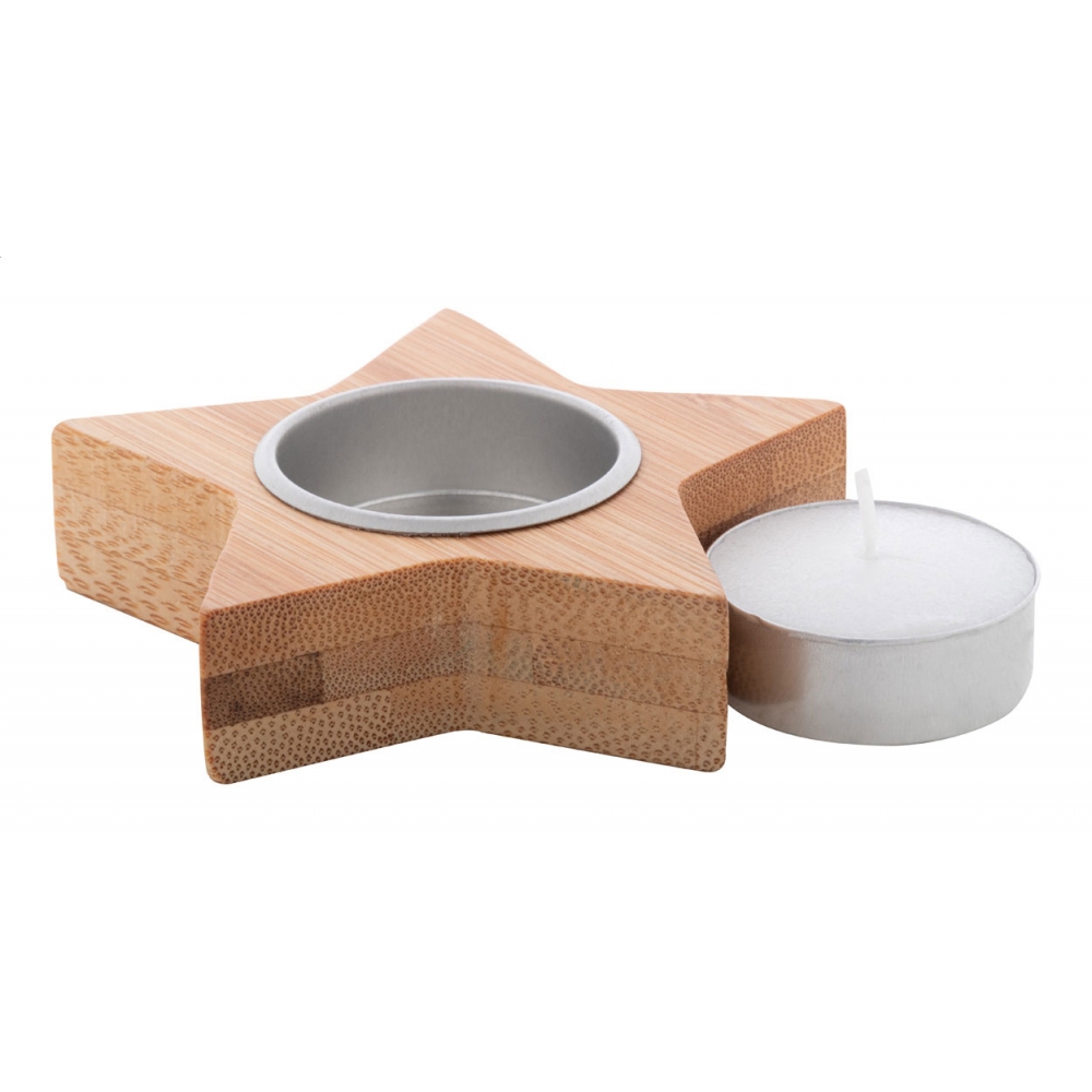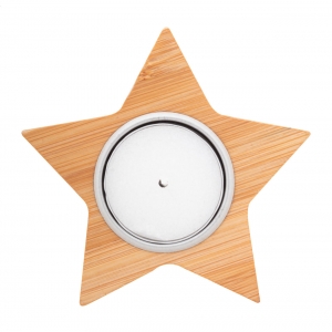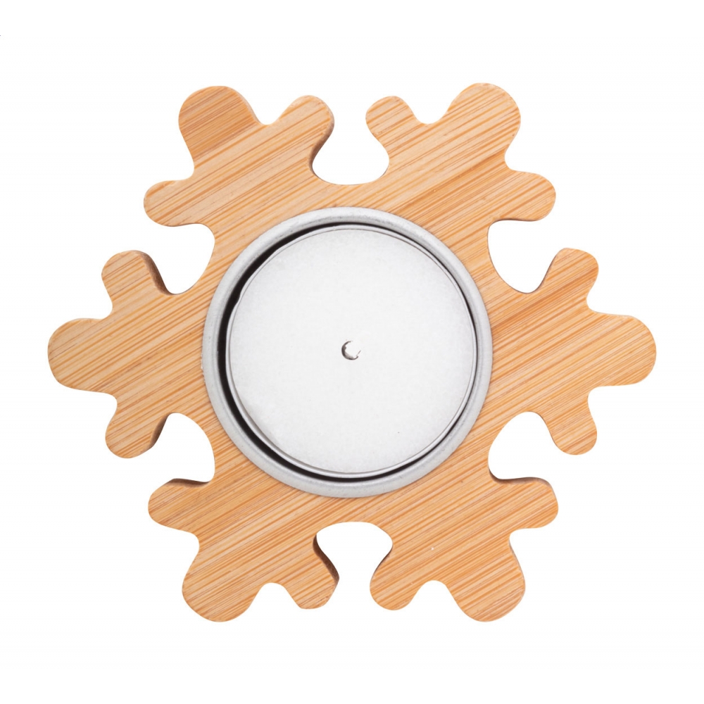 Weihnachtskerzenhalter aus Bambus mit Vanilleduft-Teelicht aus Pflanzenwachs. Brenndauer: 4 Stunden. Einzeln in Kraftpapierbox.
