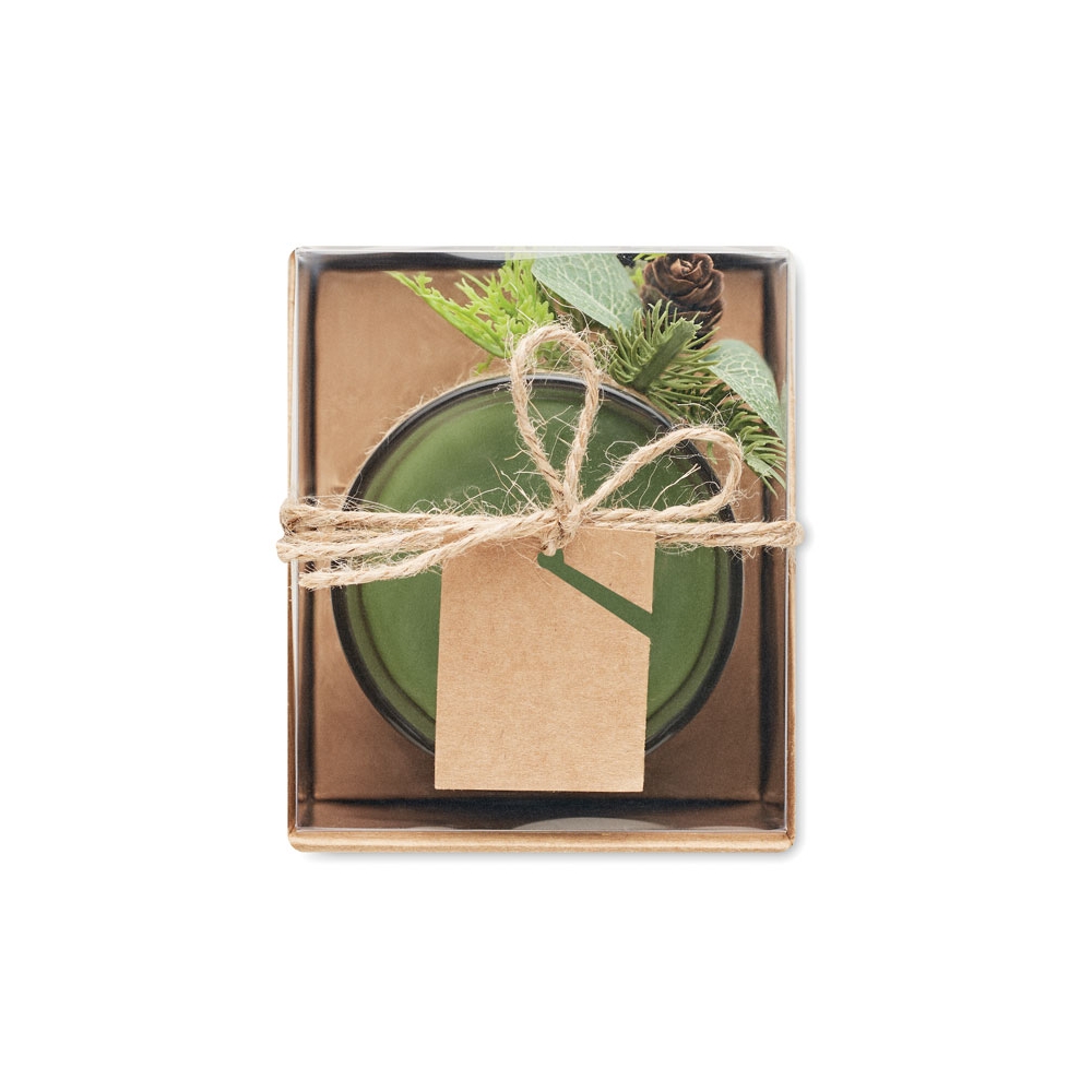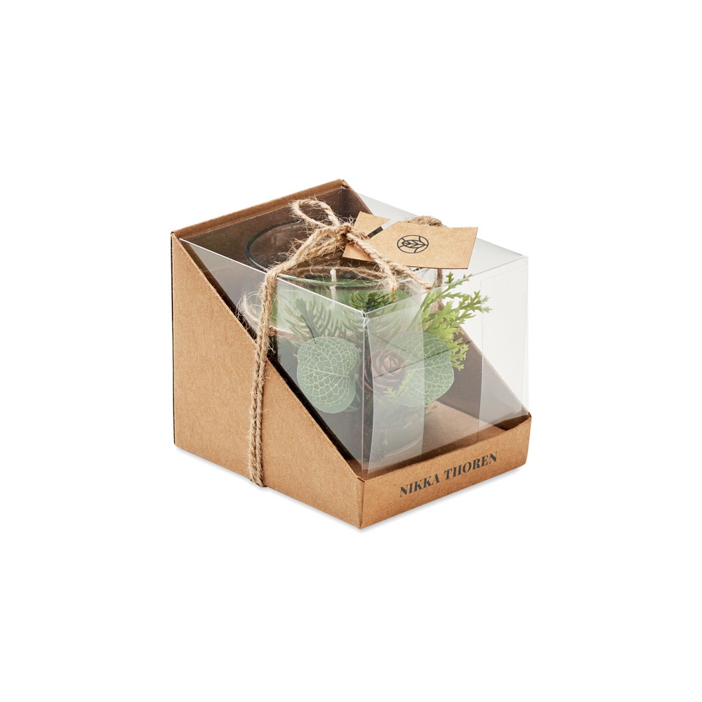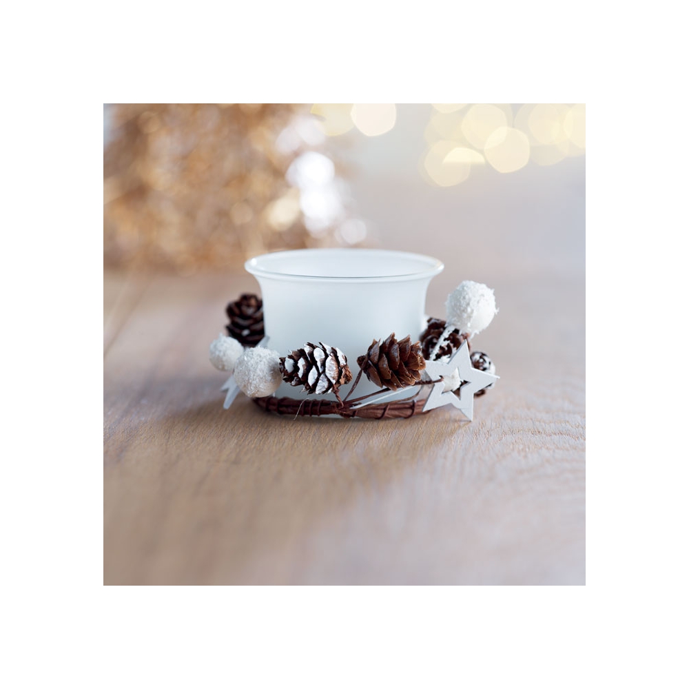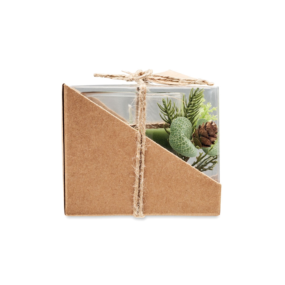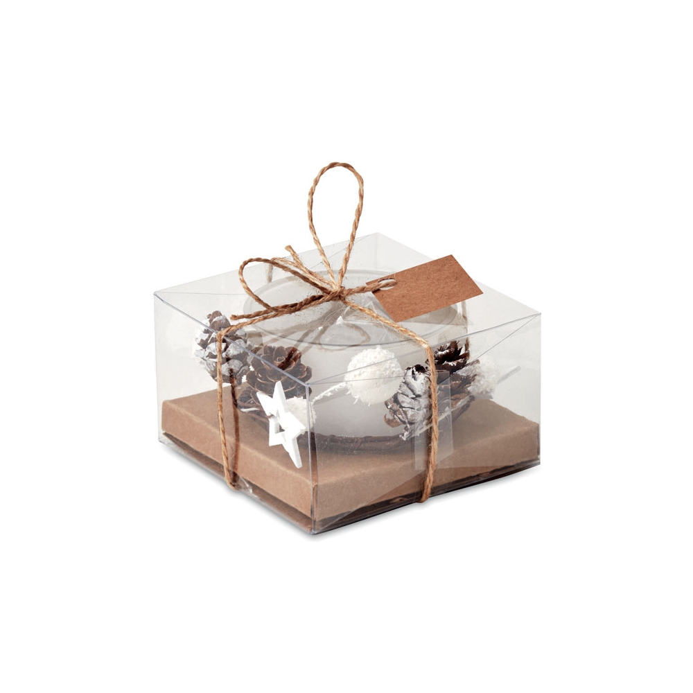 Kerzenhalter aus Glas mit weihnachtlicher Dekoration. Verpackt in einer PVC / Karton Box mit Band und Anhänger.