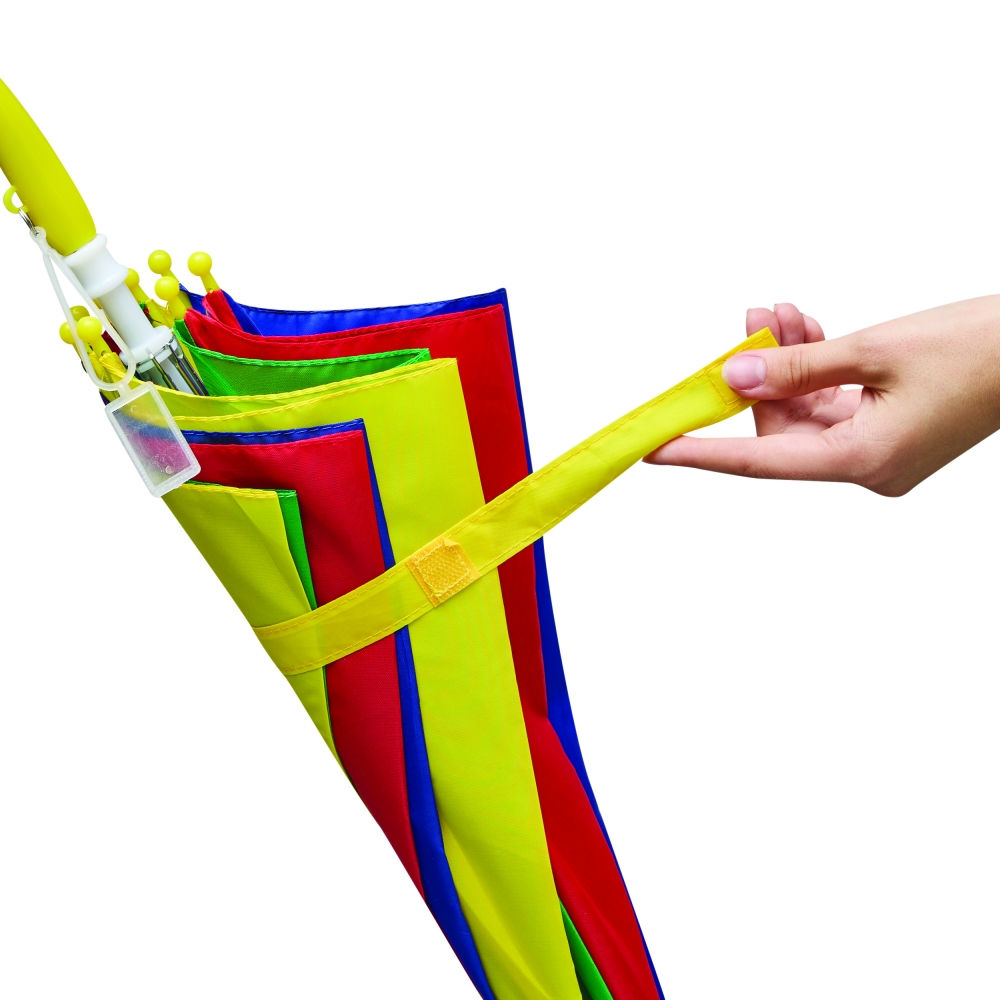 Kinderschirm LOLLIPOP mit Sicherheitsöffnung: Metallstock und Fiberglasspeichen, Kunststofftips und -Rundhakengriff, Polyester-Bespannung, Schließband mit Klettverschluss