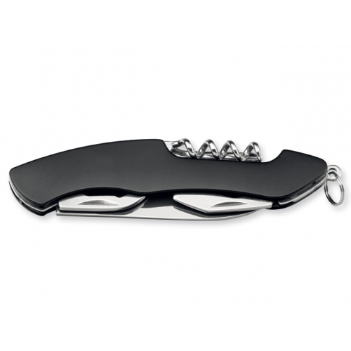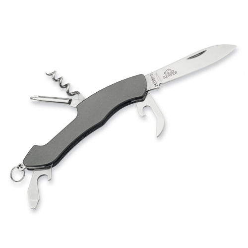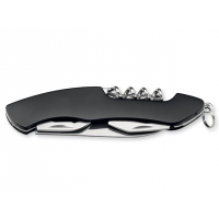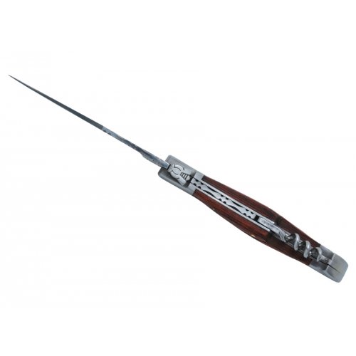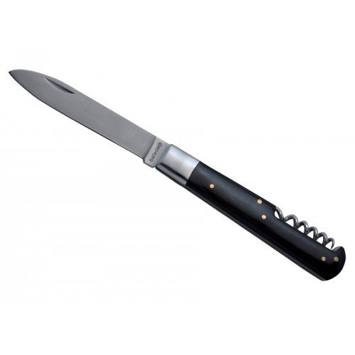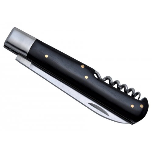 Klappmesser mit Klinge aus 420er Edelstahl. Nutzbare Klingenlänge: 10 cm. Griff aus Edelstahl und schwarzem Staminaholz. Eine geschmiedete Edelstahlkrone. Korkenzieher 5 Spiralen aus Edelstahl. Traditionelle Guillochierarbeit.