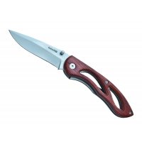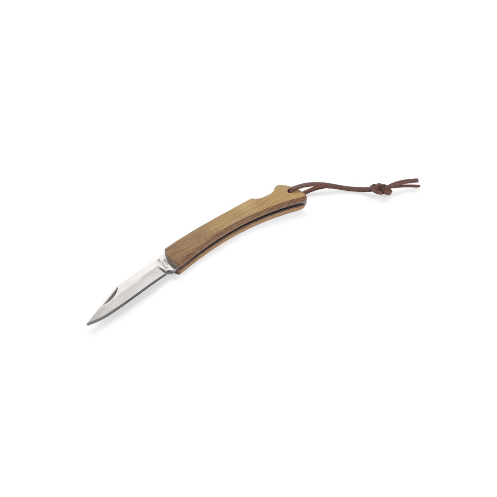 Klappmesser mit geschwungener Klinge aus 420er Edelstahl. Griff aus dunklem Massivholz. Öse zur Befestigung an Trageband oder Kette. Nutzbare Klingenlänge: 5 cm.