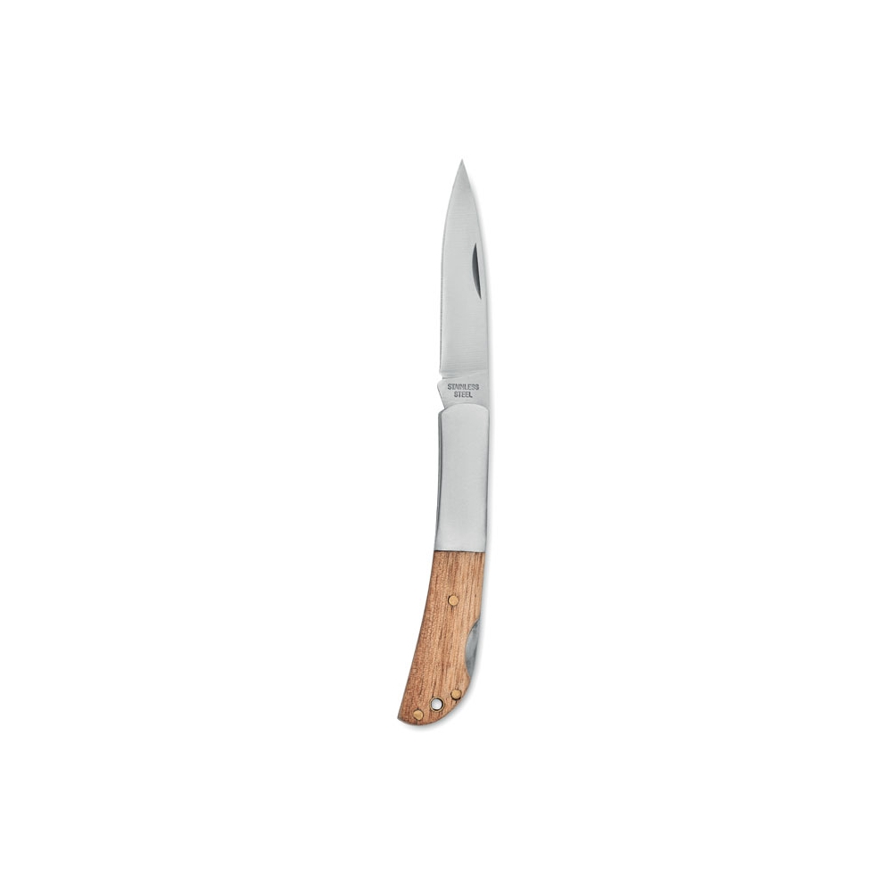 Hochwertiges, klappbares Taschenmesser aus Edelstahl mit Sicherheitsverschluss und holzummanteltem Griff. Ihre Werbung lasern wir auf die Metallfläche.