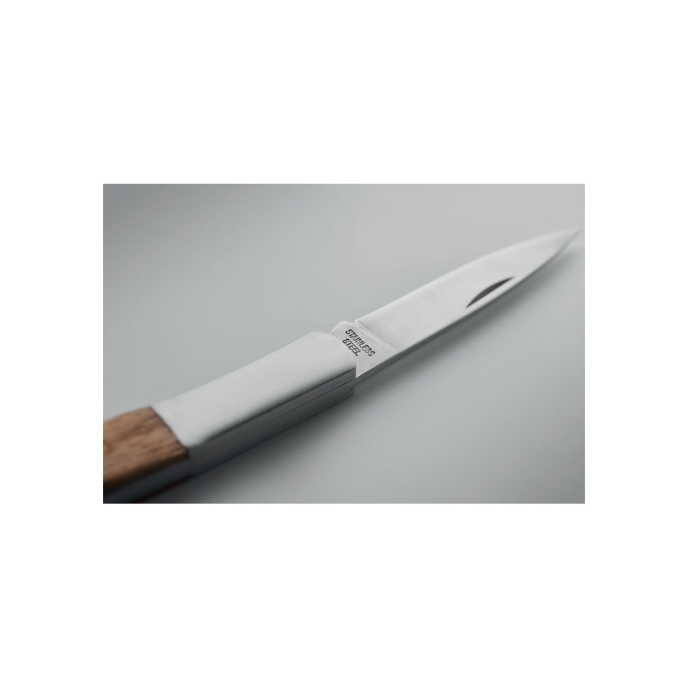 Klappmesser aus Edelstahl und Holz mit Klingensicherung. Geliefert in einer Schachtel. Da das Produkt aus natürlichen Materialien hergestellt wird, können Farbe des Produkts sowie das Druckergebnis von Produkt zu Produkt unterschiedlich sein. 84 x 11 x 24 mm | Schachtel: 94 x 33 x 16 mm