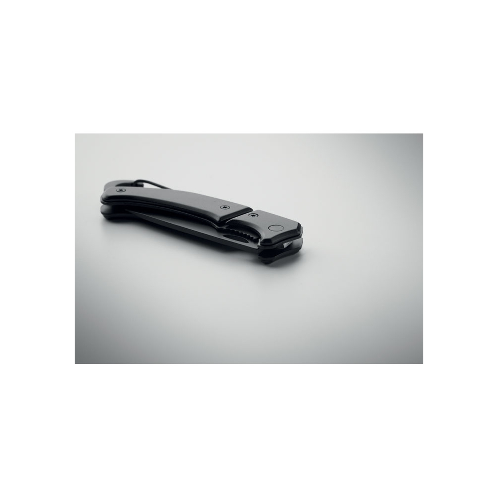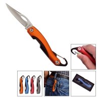 Klappmesser aus Aluminium mit Karabiner. Klinge aus Edelstahl. Der Karabiner ist NICHT als Sicherung beim Klettern geeignet.