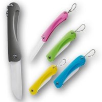 Klappmesser mit hochwertiger Keramikklinge. Superscharfes Messer zum Einklappen in die Sicherheitshülle. In schwarz, ab 500 Stück in Farbe umsetzbar. Größe: 115 x 25 x 10 mm Werbeanbringung: Tampondruck Druckfläche: 65 x 7 mm