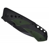 Klinge aus 420er rostfreiem Edelstahl, Titanbeschichtung, Griff aus rostfreiem Edelstahl in der Farbe schwarz mit G10-Fasern in grüner Farbe. Sicherheitssperre, Einhändig auf- und zuklappbar. Gürtelclip. G10 besteht aus glasfaserverstärktem Epoxydharz. Das Material ist wasserabweisend, verfügt über eine exzellente Hitzebeständigkeit (bis 180 °C) und ist schwach leitend.