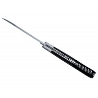 Klappmesser mit geschwungener Klinge aus 420er Edelstahl. Griff aus schwarzem Staminaholz. Ring zum Anhängen einer Kette oder Kordel. Nutzbare Klingenlänge: 7,5 cm.