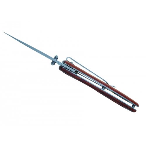 Einhandmesser, geeignet für Rechts- und Linkshänder mit matter Klinge aus rostfreiem Edelstahl 420. Liner-Lock Verriegelung. Klingenlänge: 8,5 cm. Griff aus Rosenholz. Gürtelclip aus Edelstahl.