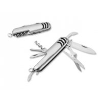 Klappmesser mit halb gezahnter 420er Edelstahlklinge, Titanüberzug. Einhandöffnung. Sicherheitssperre vom Typ Liner Lock. Nutzbare Klingenlänge: 10 cm. Griff aus Edelstahl und Aluminium in Tarnfarben. Gürtelclip. Korkenzieher 4 Spiralen aus Edelstahl mit Titanüberzug. Traditionelle Guillochierarbeiten. Lieferung mit Gürteletui aus schwarzem Nylon 600D.