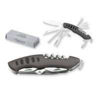 Laguiole Set bestehend aus Messer und Kellnermesser. Klappmesser mit Klinge aus 420er Edelstahl. Nutzbare Klingenlänge: 9 cm. Griff aus Edelstahl und Eschenholz. Rückenfeder guillochiert Eine geschmiedete Edelstahlkrone. Professionnelles Kellnermesser. Griff aus Eschenholz und Edelstahl. Korkenzieher 5 Spiralen aus Edelstahl, Kapselschneider gezahnt, Flaschenöffner. Lieferung mit gesticktem schwarzem Nylonetui. Präsentiert in schwarzem Geschenkkarton mit MagnetVerschluss.