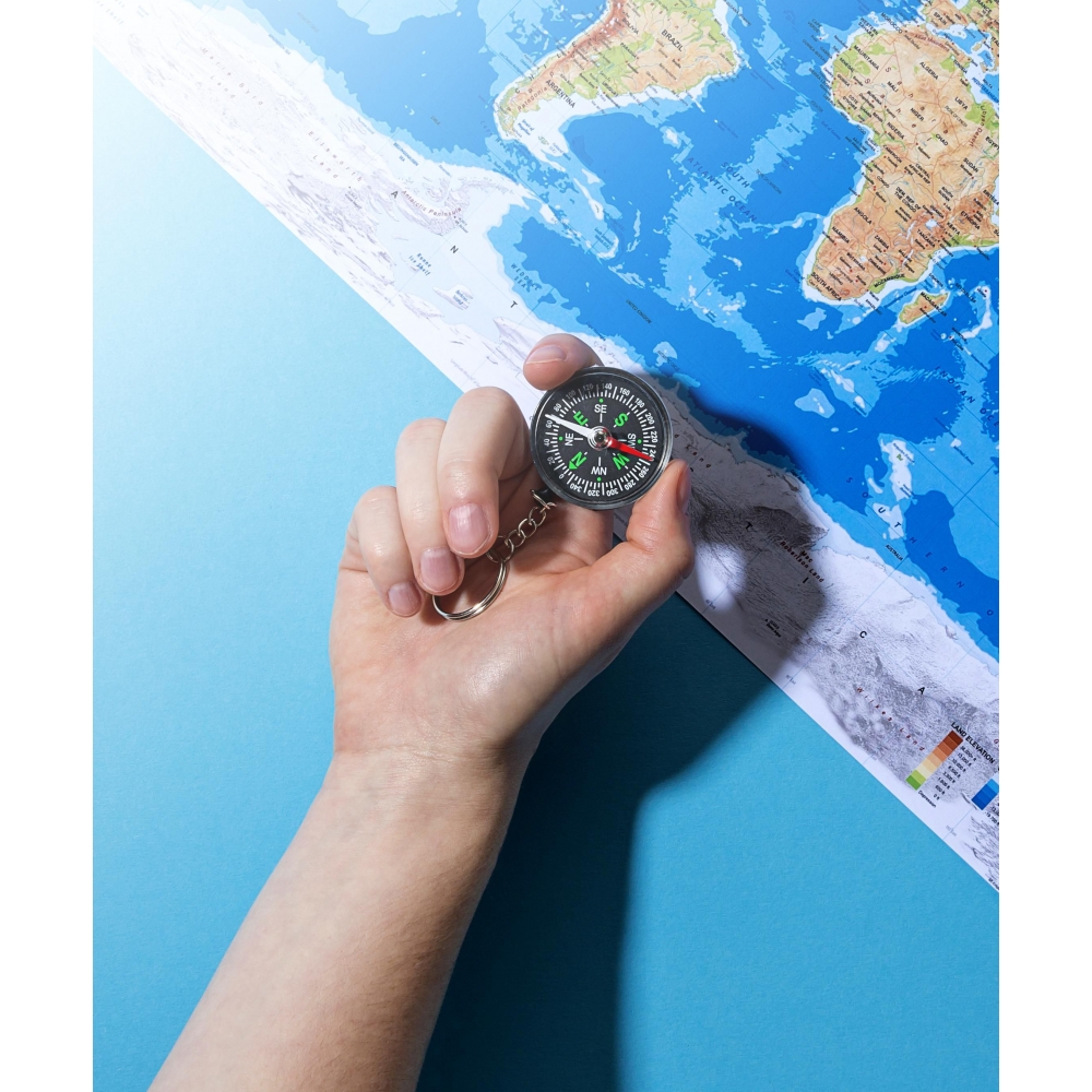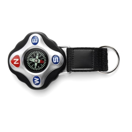 Schlüsselanhänger aus Kunststoff mit Kompass und Metallring.