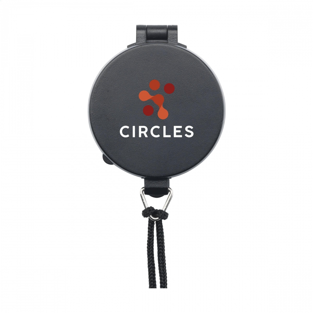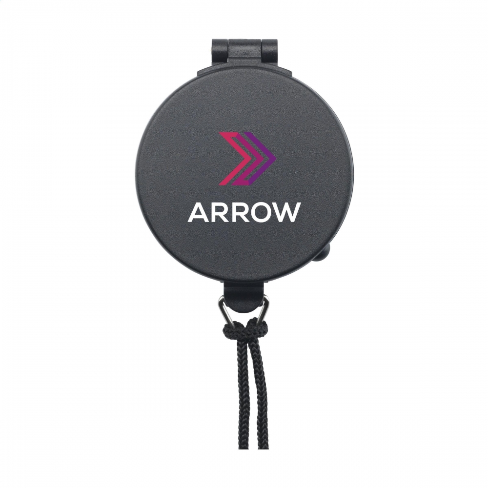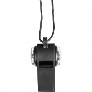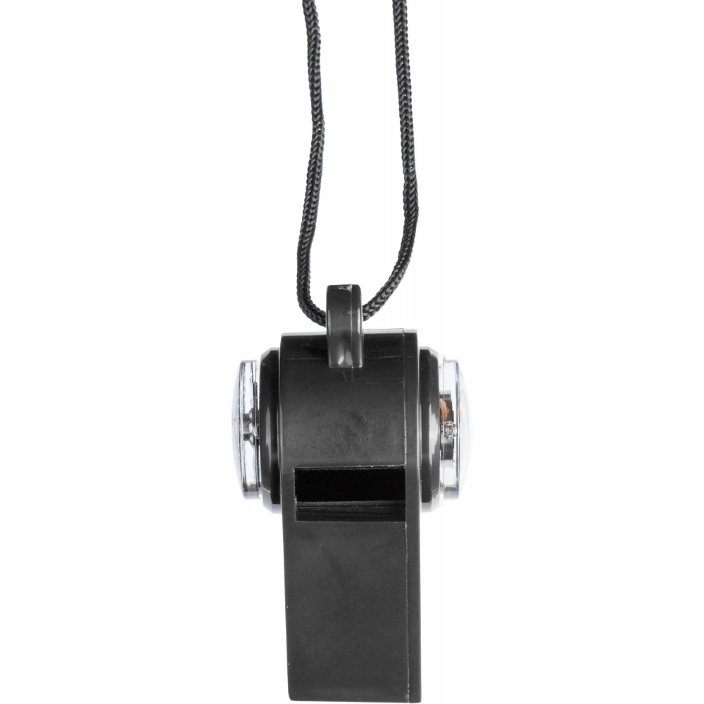 PP-Pfeife (90 dB) mit Kompass und Thermometer an der Seite. Das Thermometer zeigt die Temperatur in Celsius an. Inklusive 100 cm Polyester-Band mit ABS-Sicherheitsschnalle. Einzeln verpackt in einer braunen Pappschachtel.