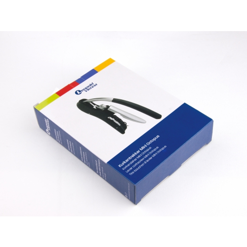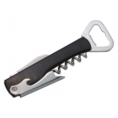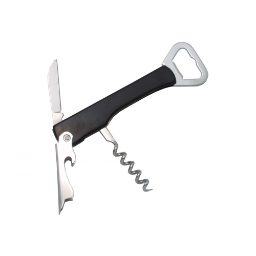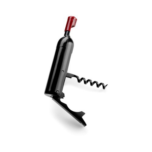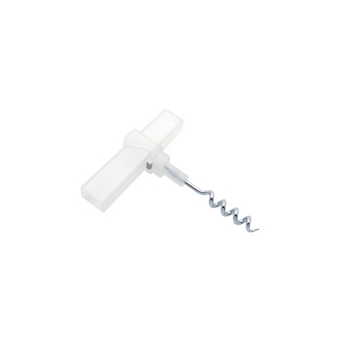 Gehäuse aus farblosem, halbtransparentem Kunststoff. Korkenzieher mit 4 Spiralen. Die Plastikabdeckung, die den Korkenzieher schützt, fügt sich geschickt mit dem oberen Element zu einem bequemen Griff zusammen. In geschlossenem Zustand ein leicht zu bedienender Flaschenöffner. Ein cleveres und preiswertes Produkt !