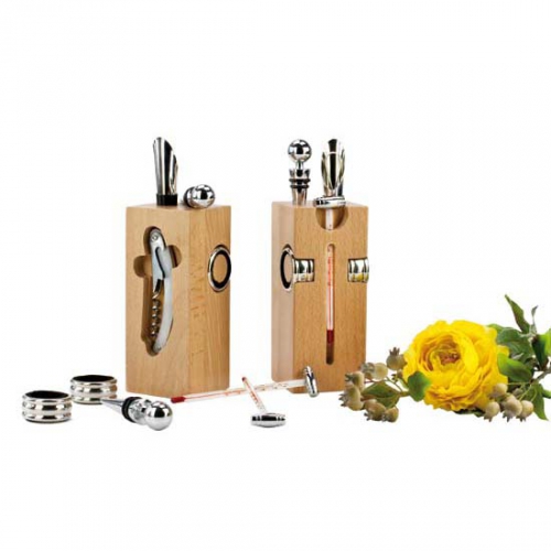 Der Korkenzieher Classic Pulltap mit Doppelhebel, der das Entkorken des Weines revolutioniert hat. Das von Restaurant-Profis bevorzugte Modell. Vierteiliges Set: zusätzlich zum Korkenzieher, verfügt es über ein Thermometer, einen Verschluss und einen Tropfring.