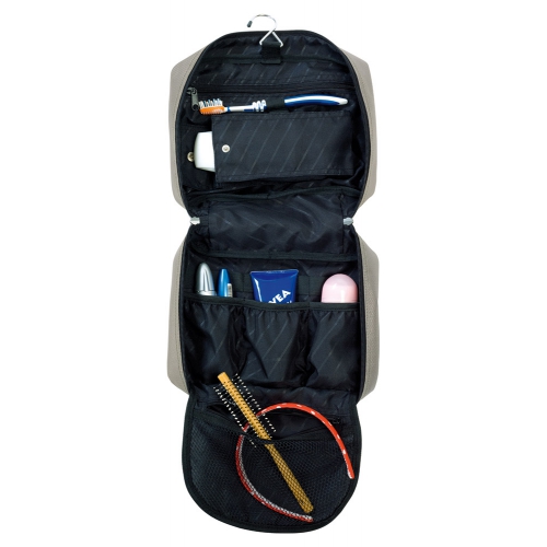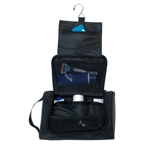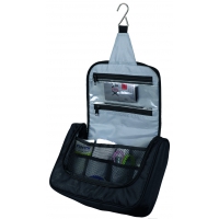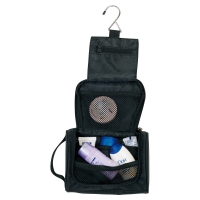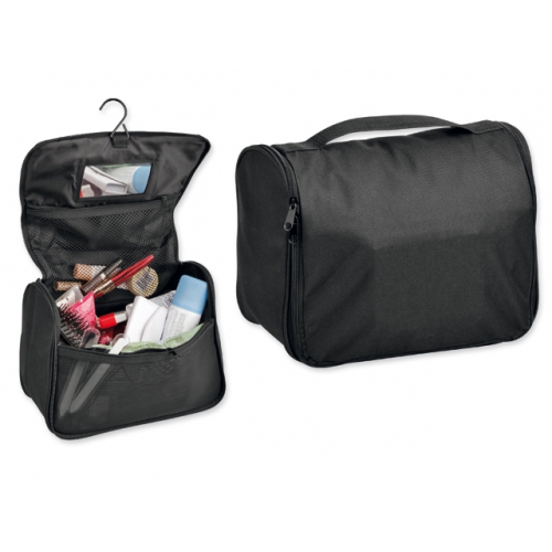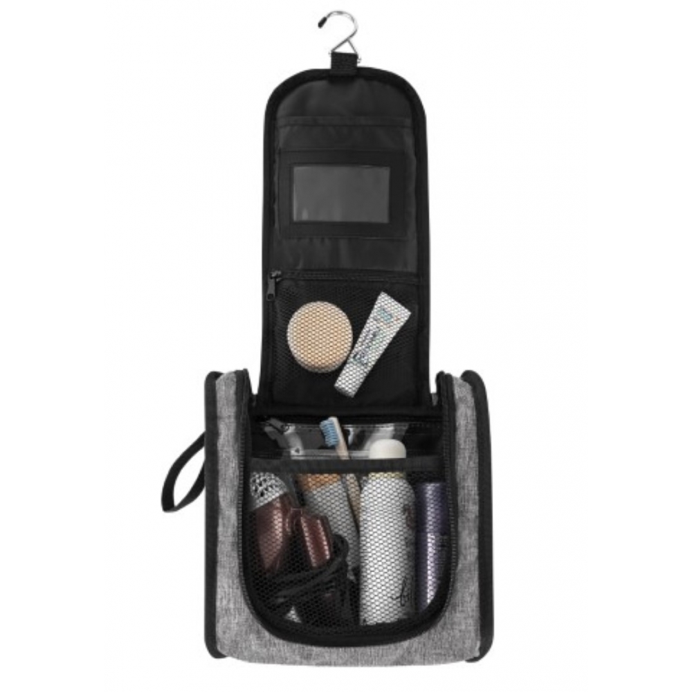 Polyester (210D) Reisekosmetiktasche mit Aufhängehaken. Geöffnete Reißverschlusstasche auf der Oberseite. Eine große und eine kleine Netztasche mit Reißverschluss. Tasche auf der Rückseite. Kurzer Tragegriff.