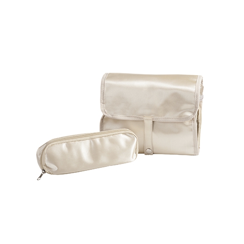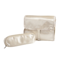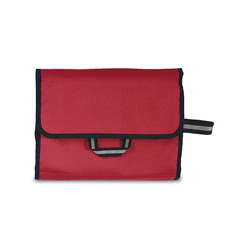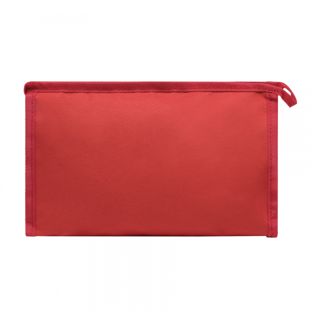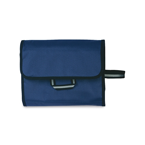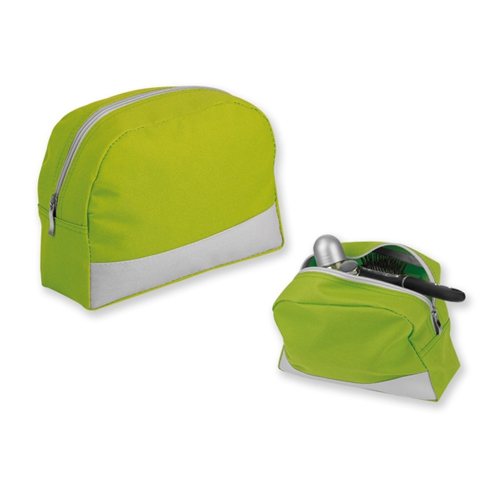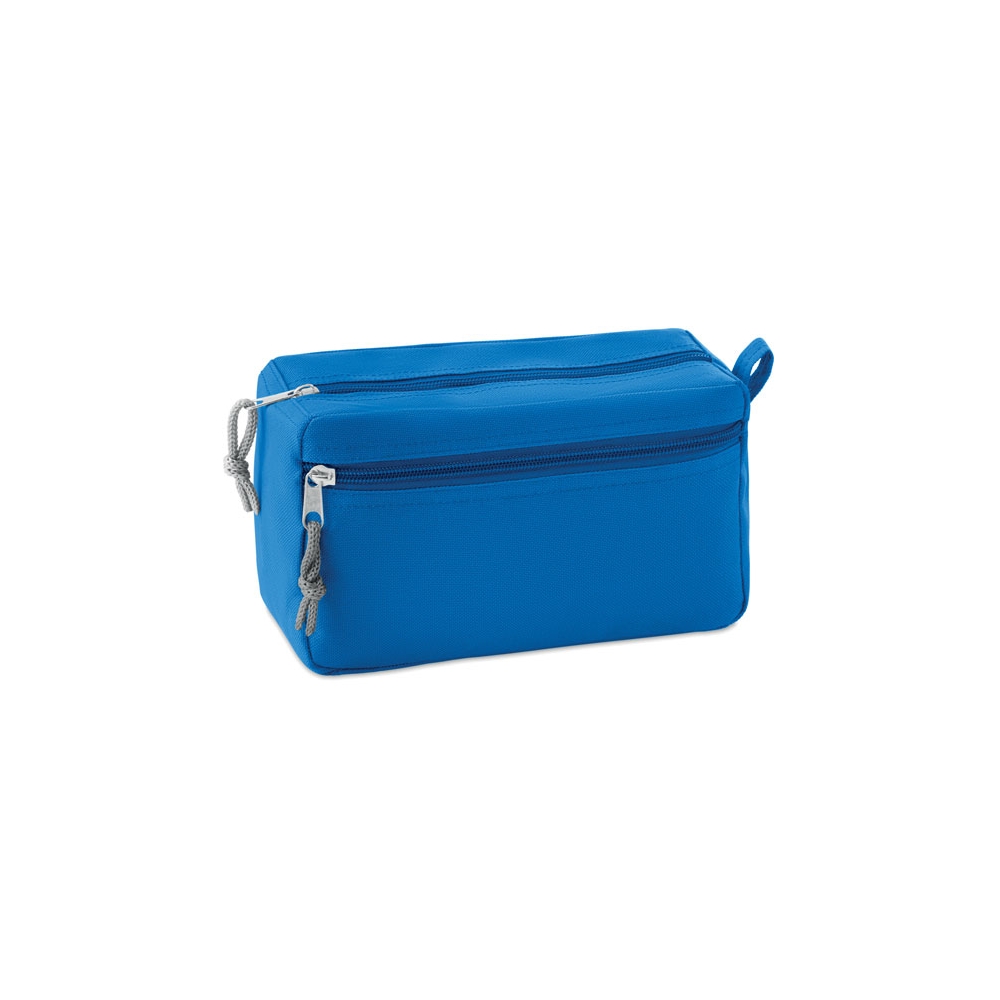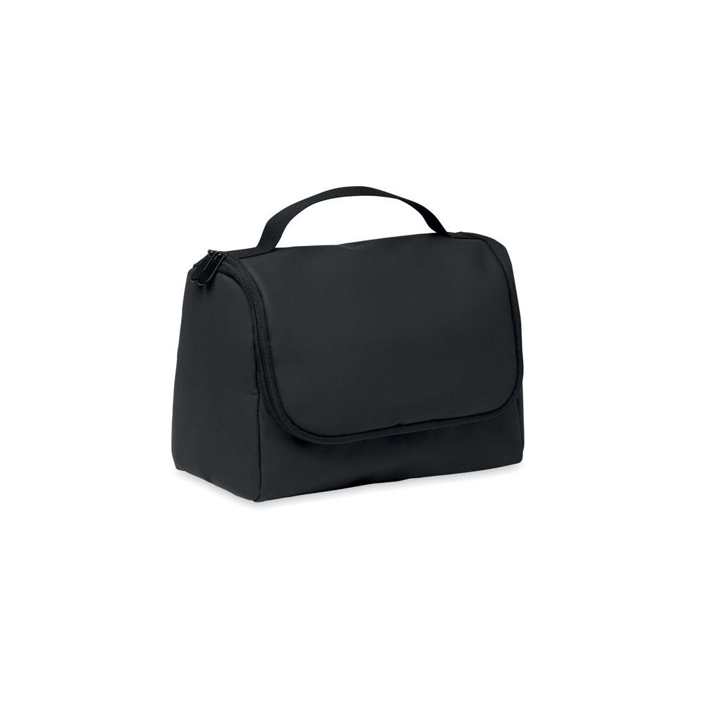 Handliche Kosmetiktasche aus 300D Polyester mit PU Handschlaufe, Netzfächern im Inneren und einem verschließbarem Vorfach. Ihre Werbung wird auf das Vorfach gedruckt.