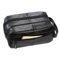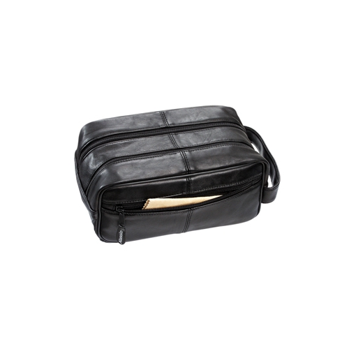 Weiche Kosmetiktasche aus recyceltem Kunstleder mit zwei Reißverschlußfächern, Tragegriff. Mit Label recyceltes Kunstleder.