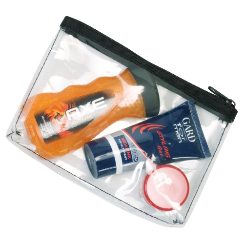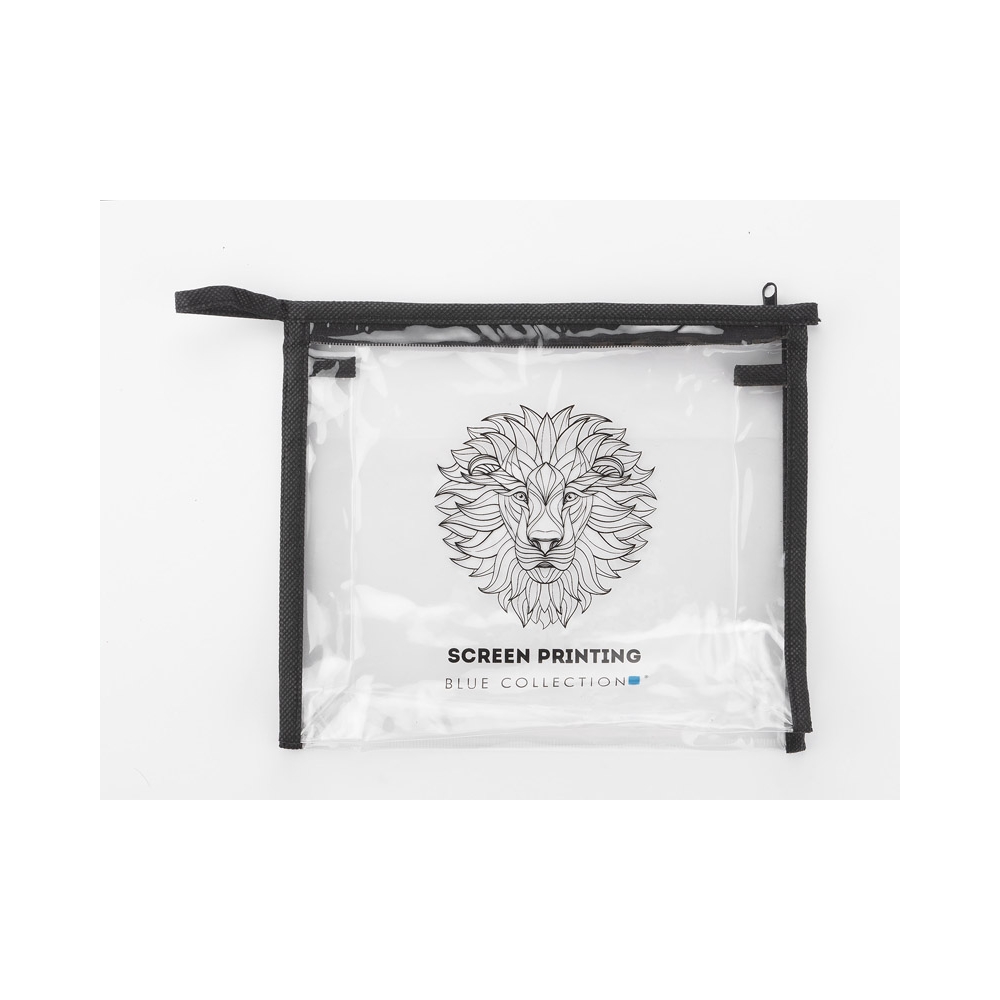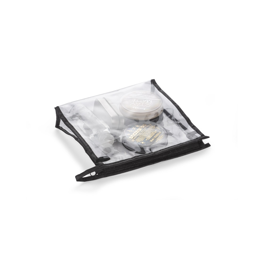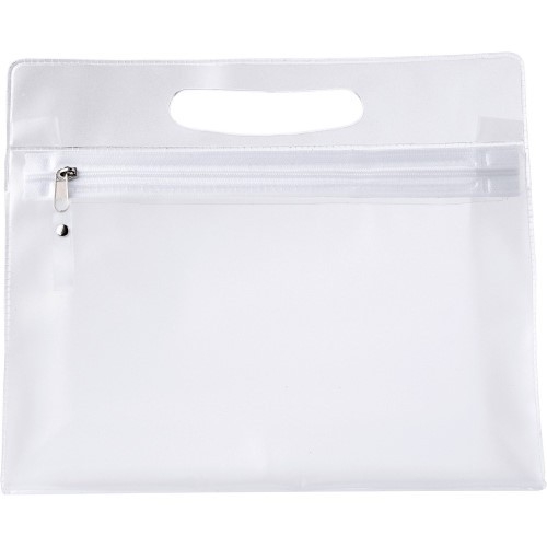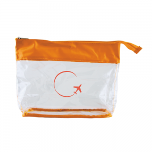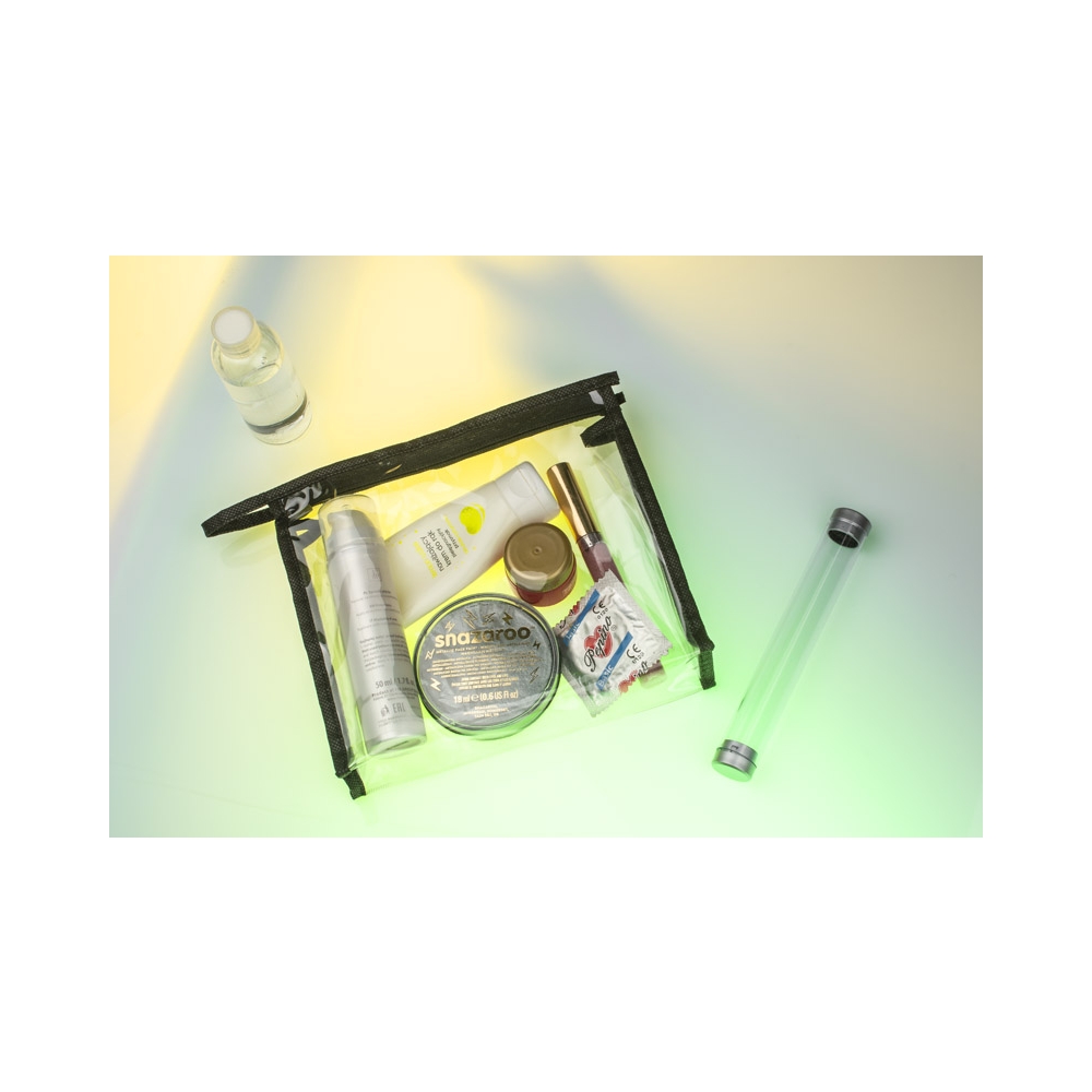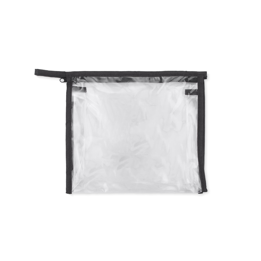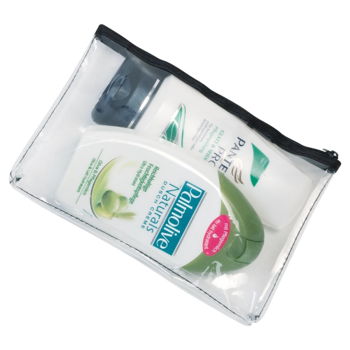 Transparente Kosmetiktasche mit Reißverschluss, aus PVC und nicht-gewebtes Polypropylen hergestellt. Perfekt als Handtasche für Flüssigkeiten für Handgepäck geeignet.