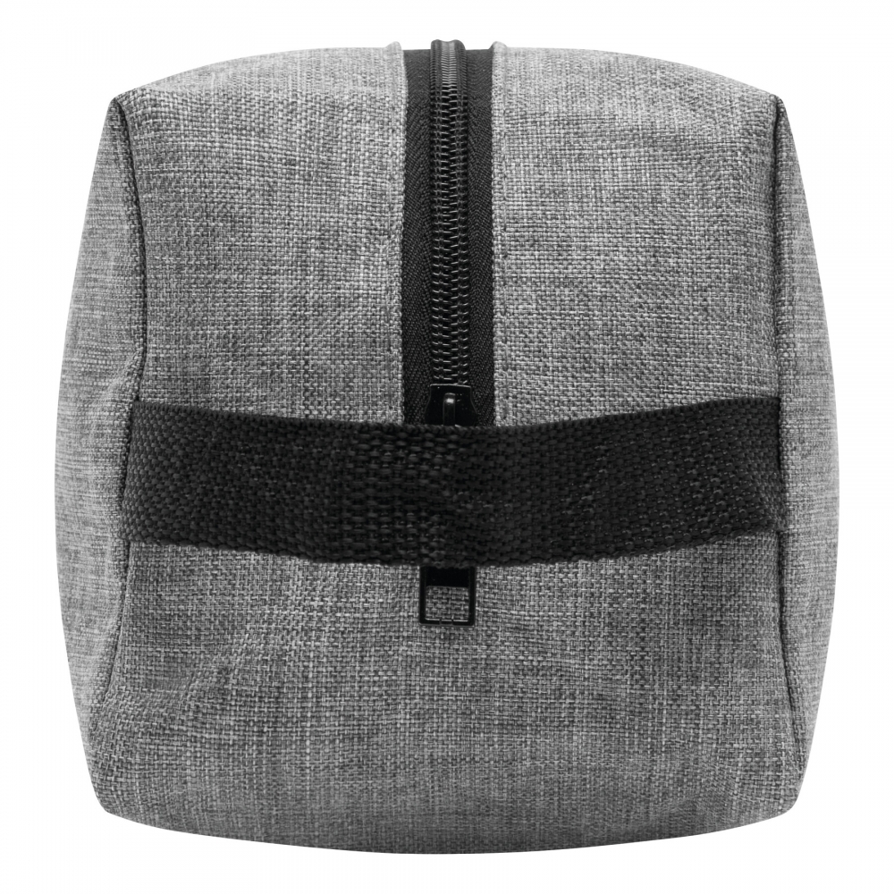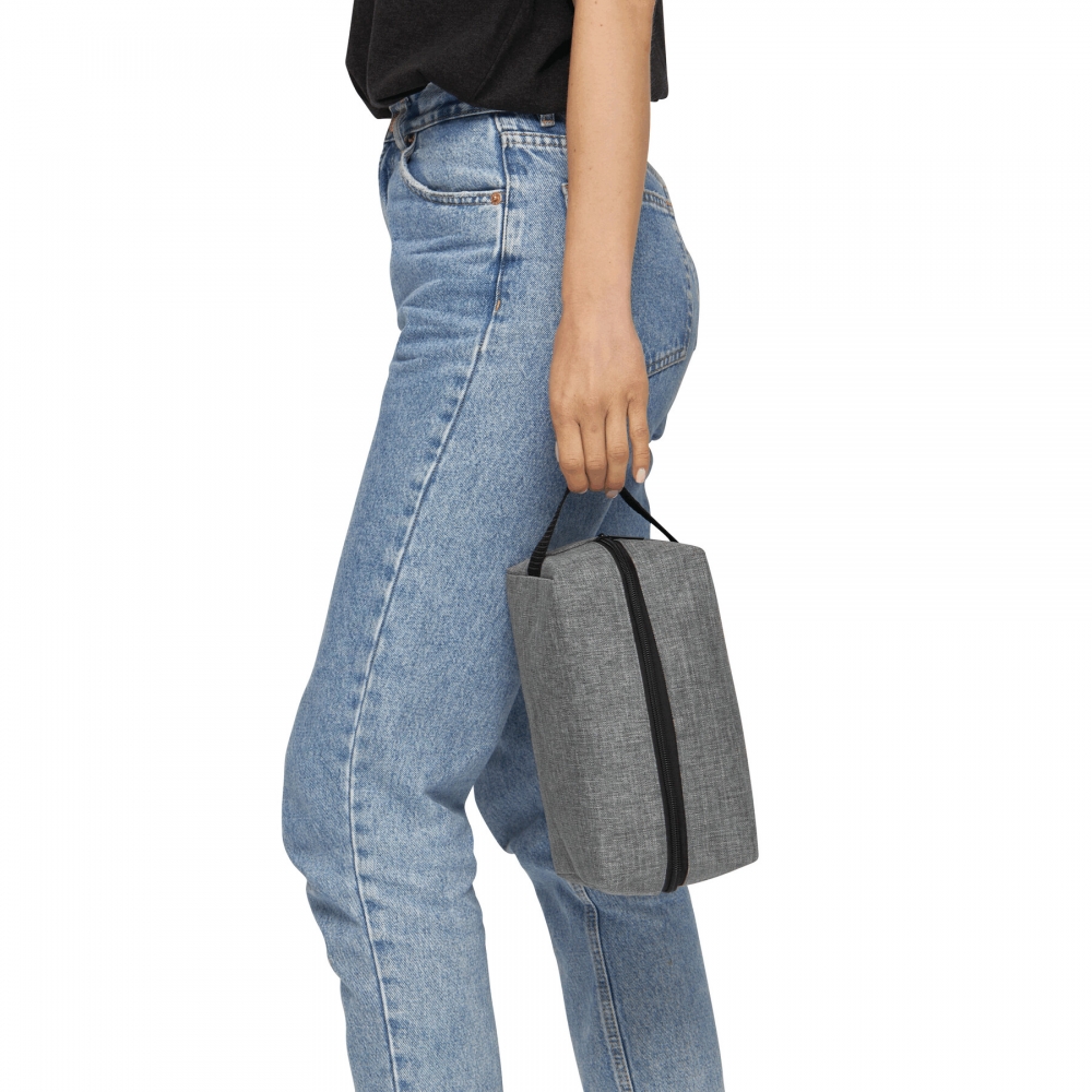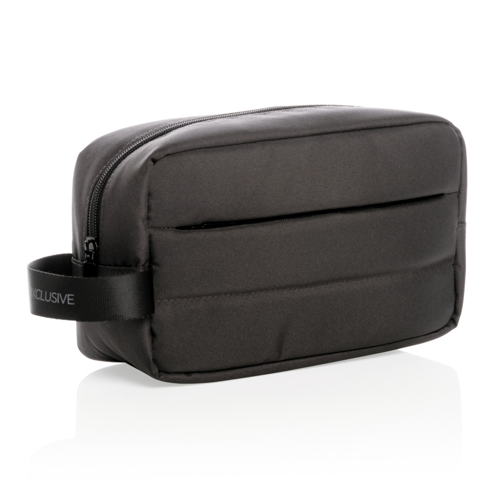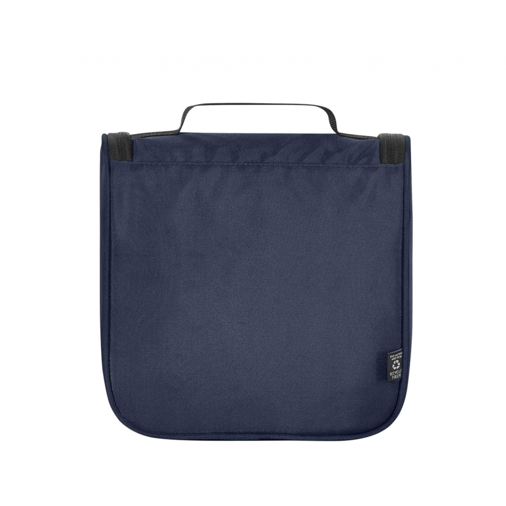 Die Kulturtasche aus recyceltem Polyester ist ein praktischer Reisebegleiter. Ihre Werbung drucken wir auf eine Seite.