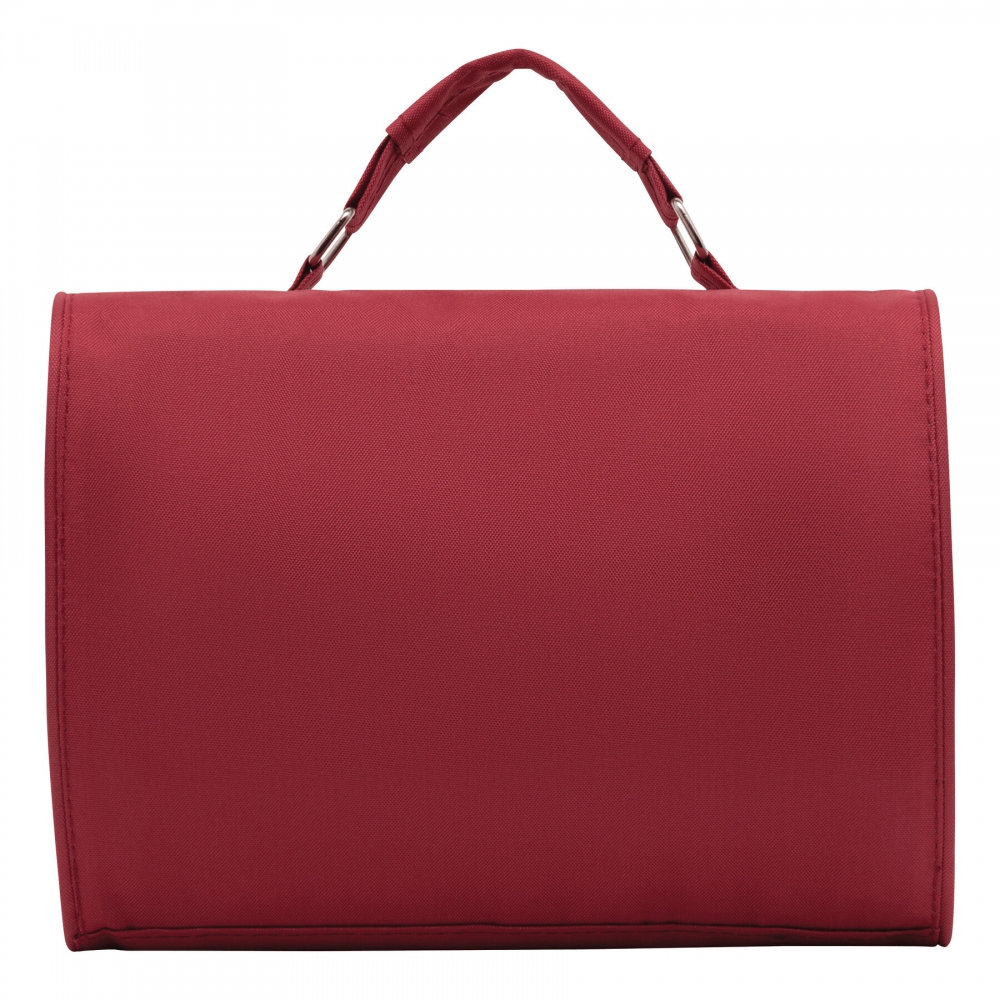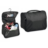 Kulturtasche aus 190D Nylon mit einem großen Innenfach, drei Reißverschlussfächern, vier Gummibändern und einem Haken zum Aufhängen. Ihre Werbung wird vorne auf die Tasche gedruckt.