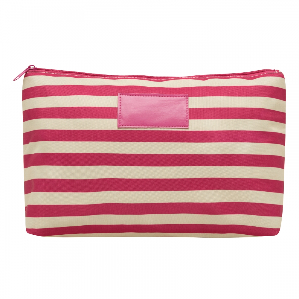 Kulturbeutel STRIPY: Hauptfach mit Reißverschluss, innen ein kleines Reißverschlussfach, Kosmetiktasche außen im maritimen Streifen-Look und mit Kunstleder-Applikation auf der Front für eine Werbeanbringung – ideal für Kosmetik und Pflegeartikel