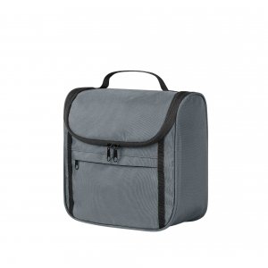 Attraktiver Kulturtasche zum Hängen oder Stellen; recycelter Oberstoff; Reißverschlussvortasche; Schlaufenband auf der Front; dreiseitig umlaufender 2-Wege-Reißverschluss; Reißverschluss-Fach im Deckel; vier Netz-Einsteckfächer innen; Handgriff
