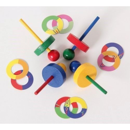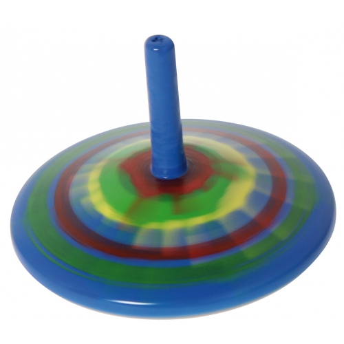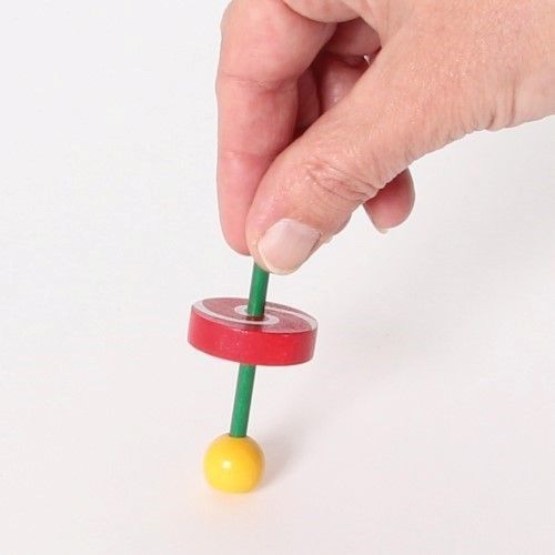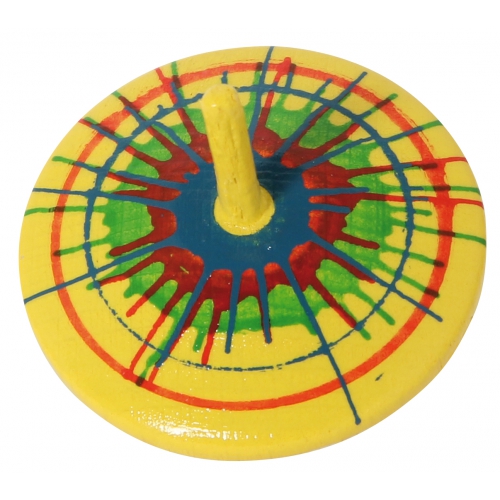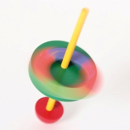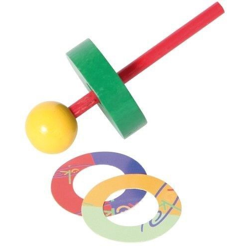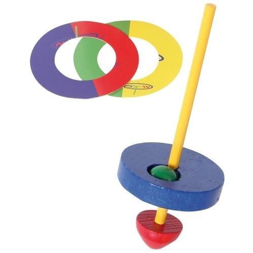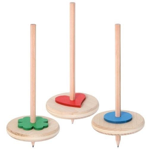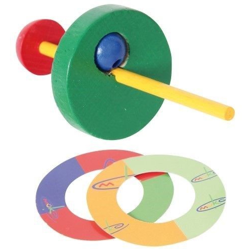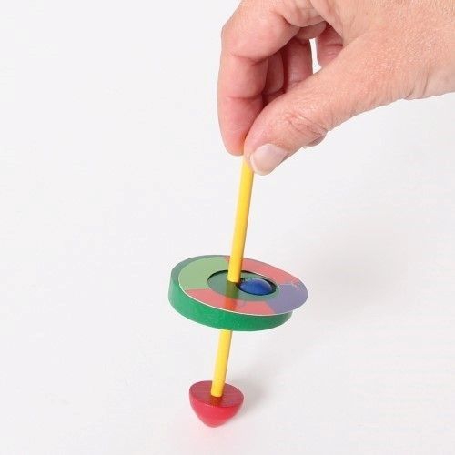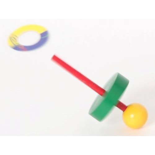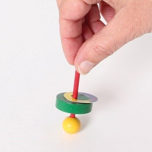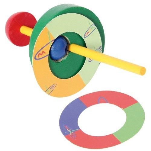 Der Kreisel aus bunten Holzteilen taumelt erst leicht, dann immer stärker, je langsamer er sich dreht. Kurz bevor er umfällt, schleudert er die beiden Papierscheiben von sich. Verschiedene Farben sortiert. Achtung! Nicht geeignet für Kinder unter 36 Monaten.