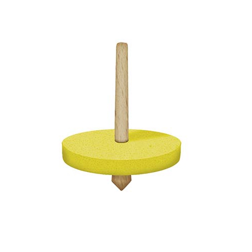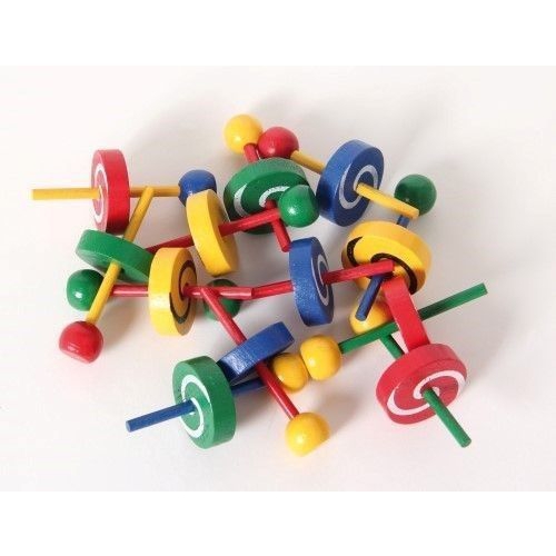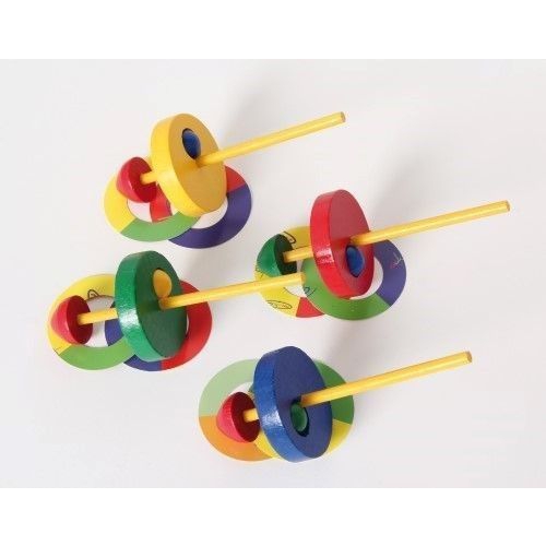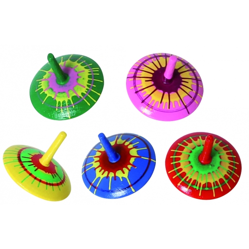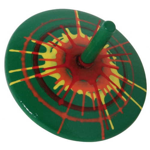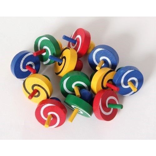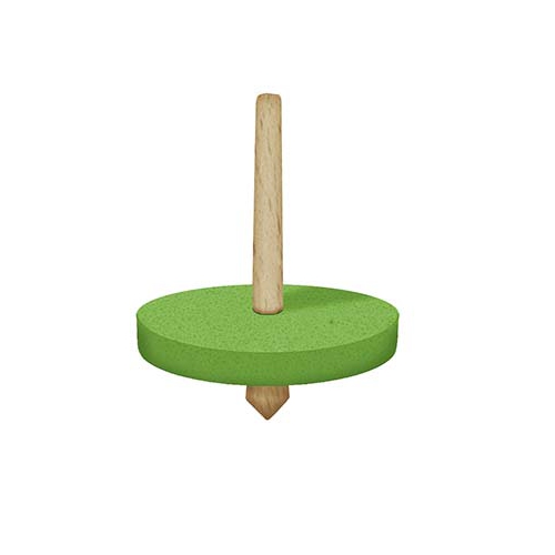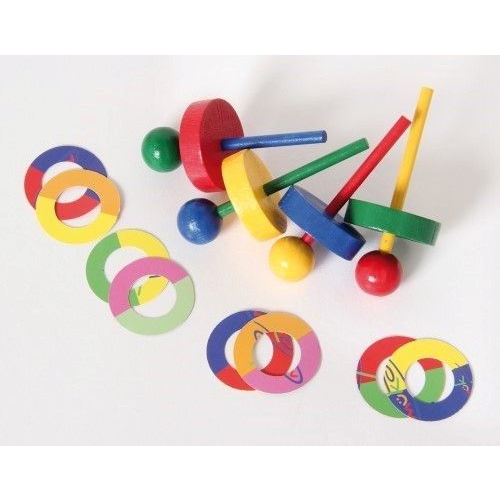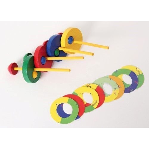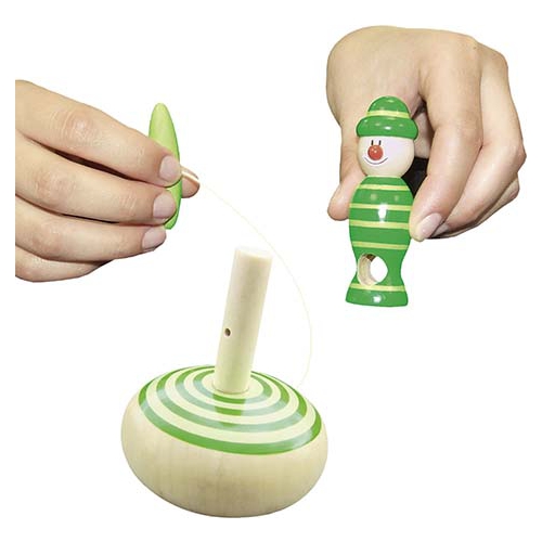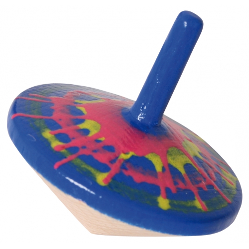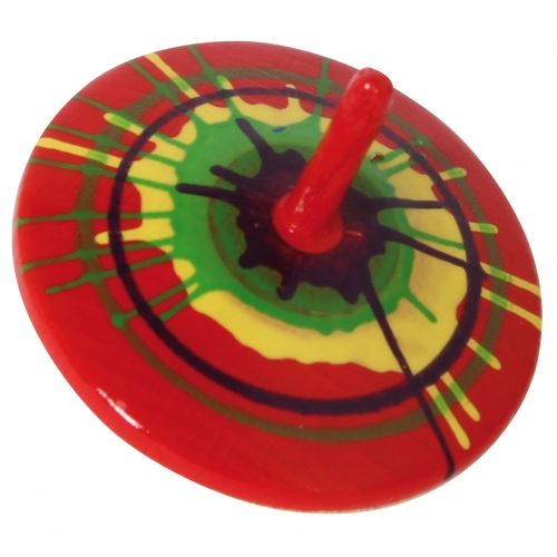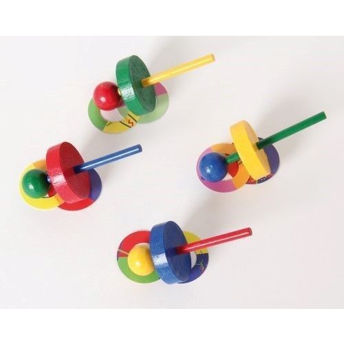 Der Kreisel aus bunten Holzteilen taumelt erst leicht, dann immer stärker, je langsamer er sich dreht. Kurz bevor er umfällt, schleudert er die beiden Papierscheiben von sich. Verschiedene Farben sortiert. Achtung! Nicht geeignet für Kinder unter 36 Monaten.