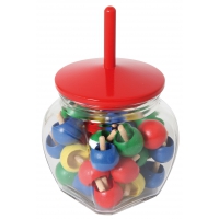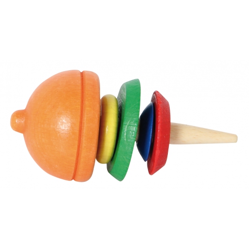 Der Kreisel aus bunten Holzteilen taumelt stark, anstatt sich ruhig zu drehen. Verschiedene Farben sortiert. Achtung! Nicht geeignet für Kinder unter 36 Monaten.