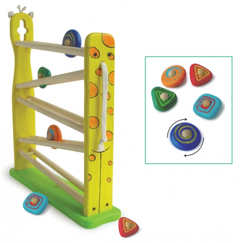 Aus massivem Holz. Im Giraffendesign. Mit fünf Rollkörpern, die auch als Kreisel verwendbar sind. Ab 18 Monaten. Achtung! Nicht geeignet für Kinder unter 36 Monaten.