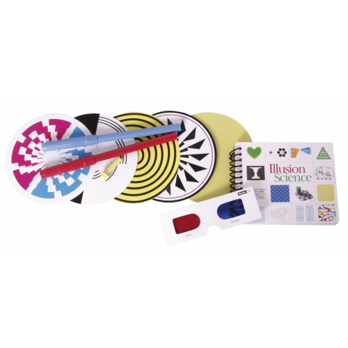 Sechs beidseitig bedruckte Pappscheiben lassen den Kreisel in zwölf Farb- und Mustervariationen auf dem Tisch tanzen. Achtung! Nicht geeignet für Kinder unter 36 Monaten.