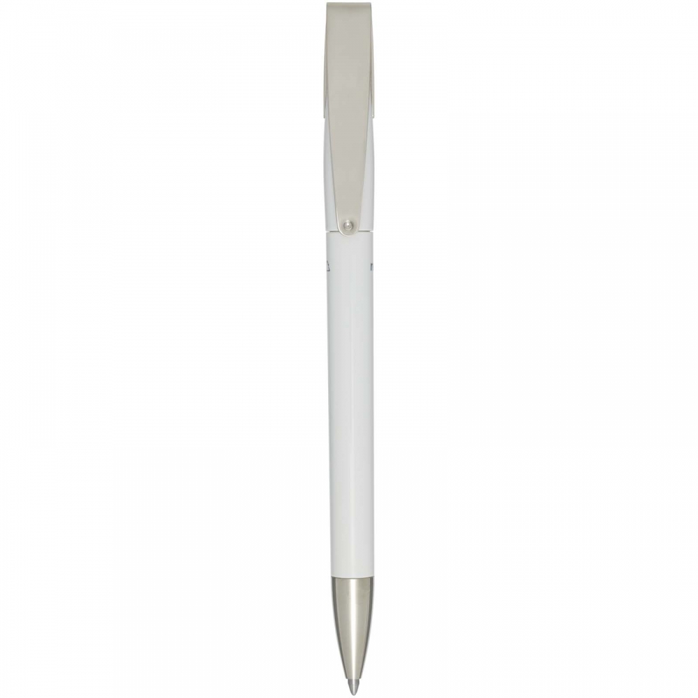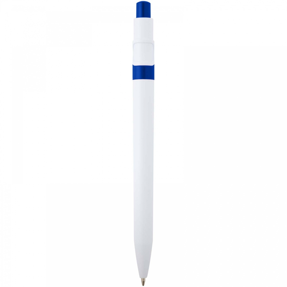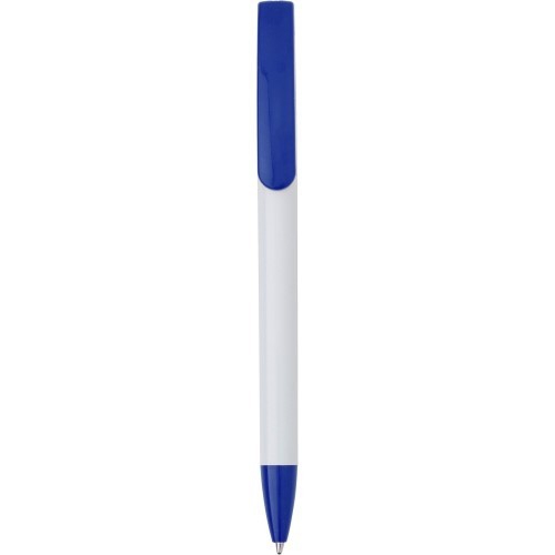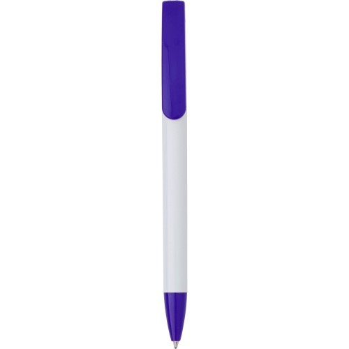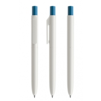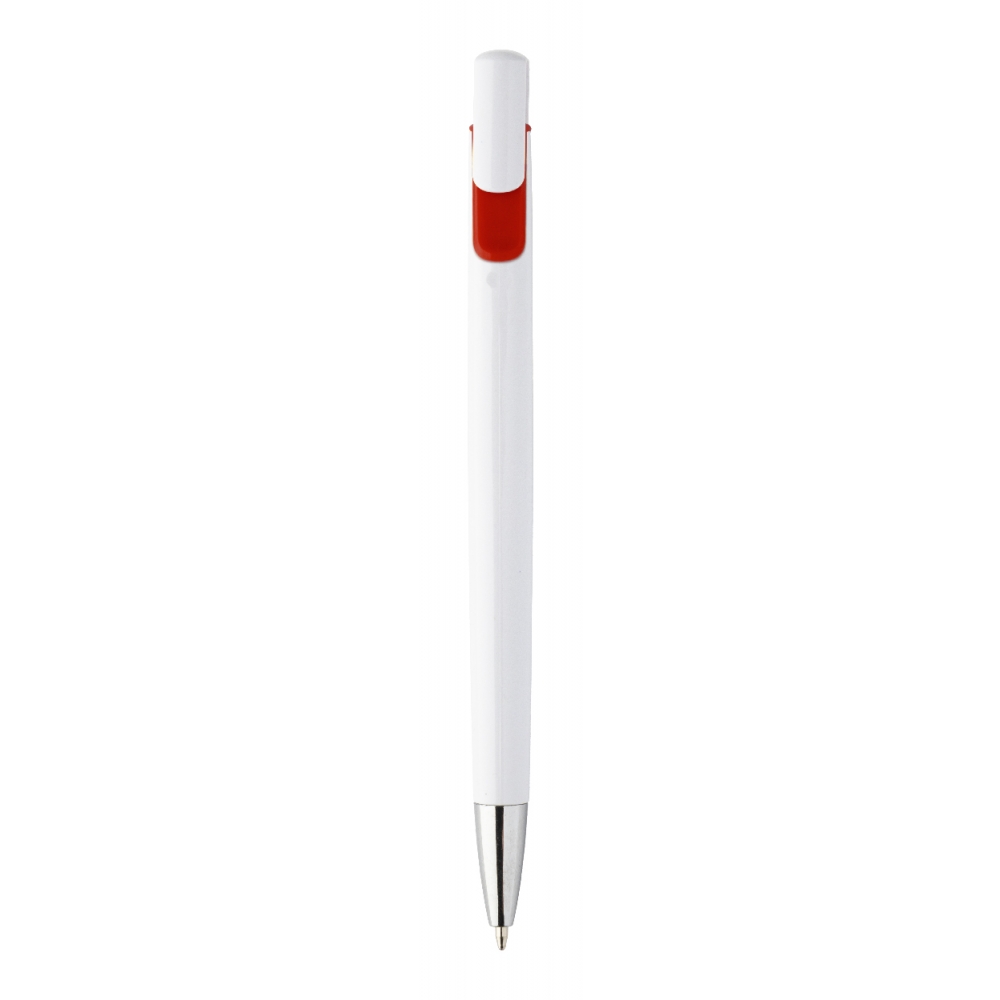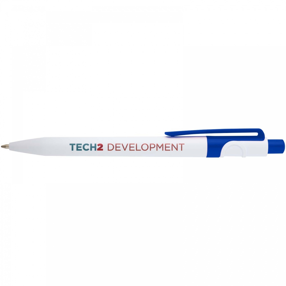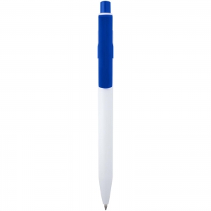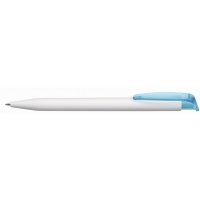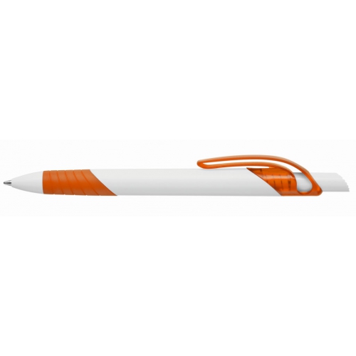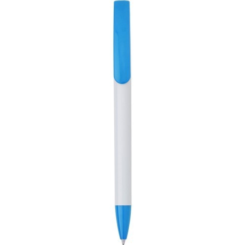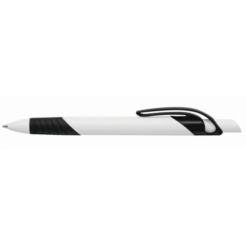 Kugelschreiber mit Push-up-Mechanismus in auffälligem, zweifarbigem Design. Gehäuse in weißer Farbe und Clip in verschieden breiten Farben. Großer Druckbereich und blaue Tintenmine.