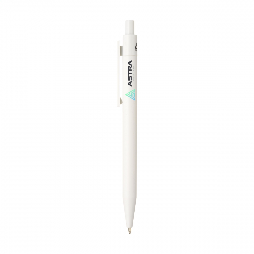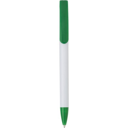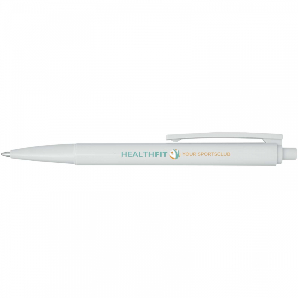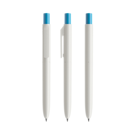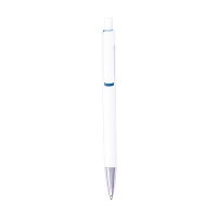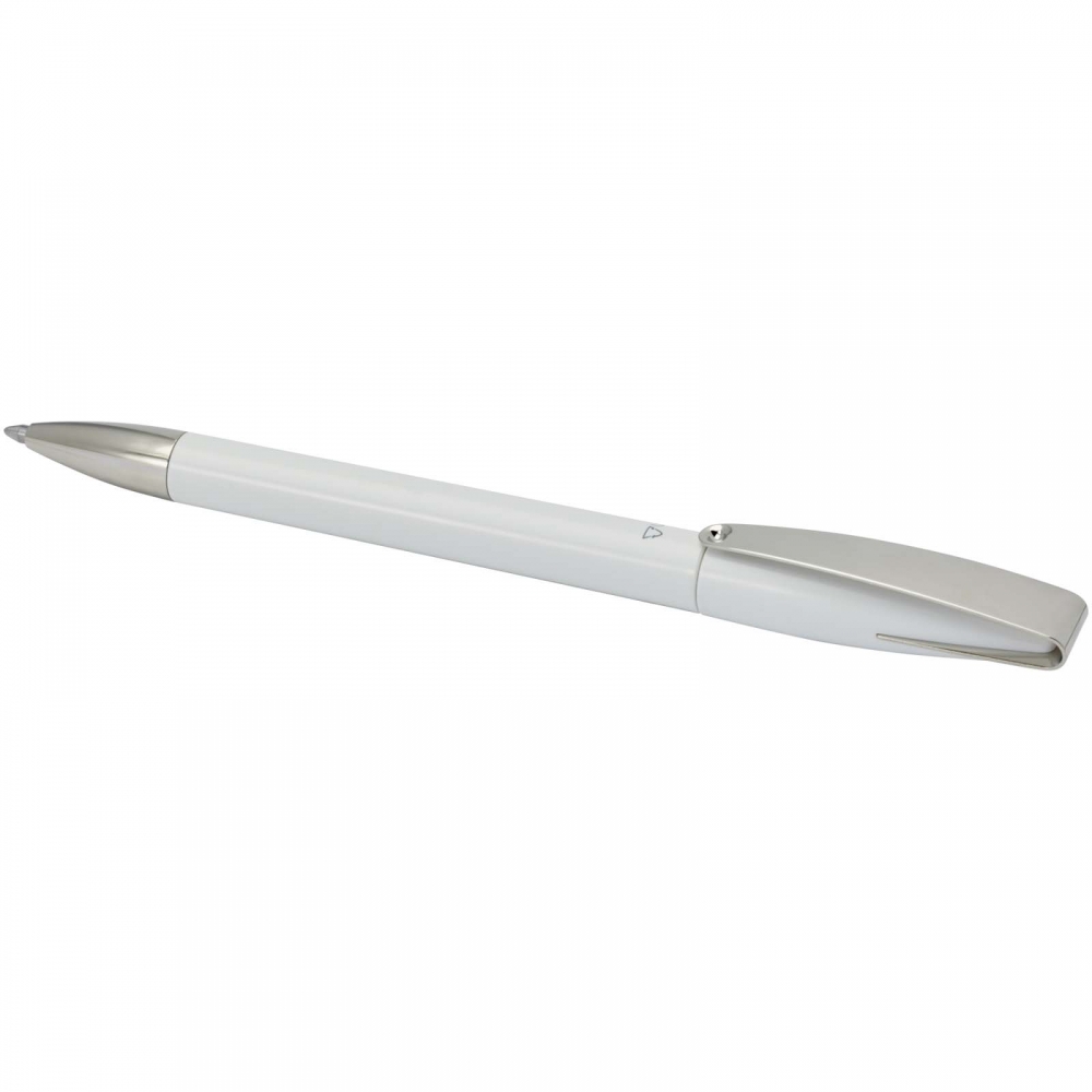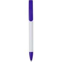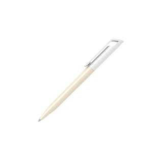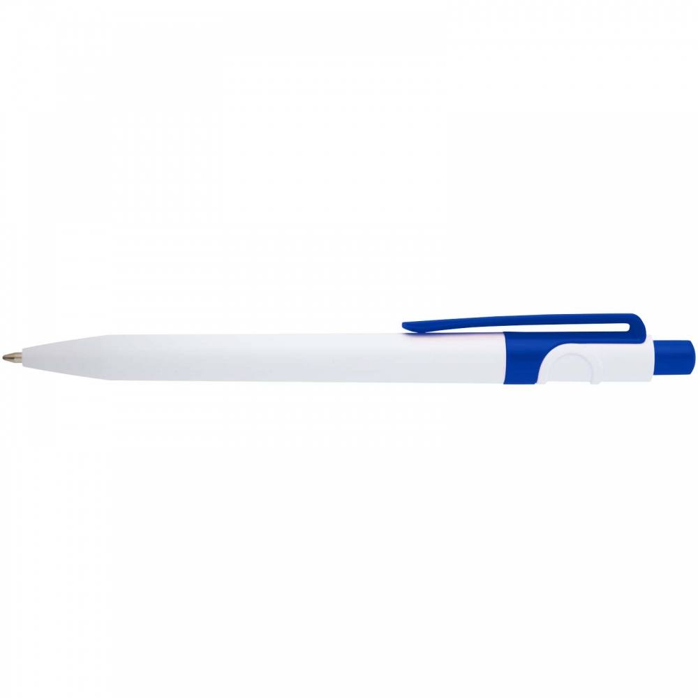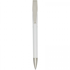 Kugelschreiber mit Push-up-Mechanismus in auffälligem, zweifarbigem Design. Gehäuse in weißer Farbe und Clip in verschieden breiten Farben. Großer Druckbereich und blaue Tintenmine.
